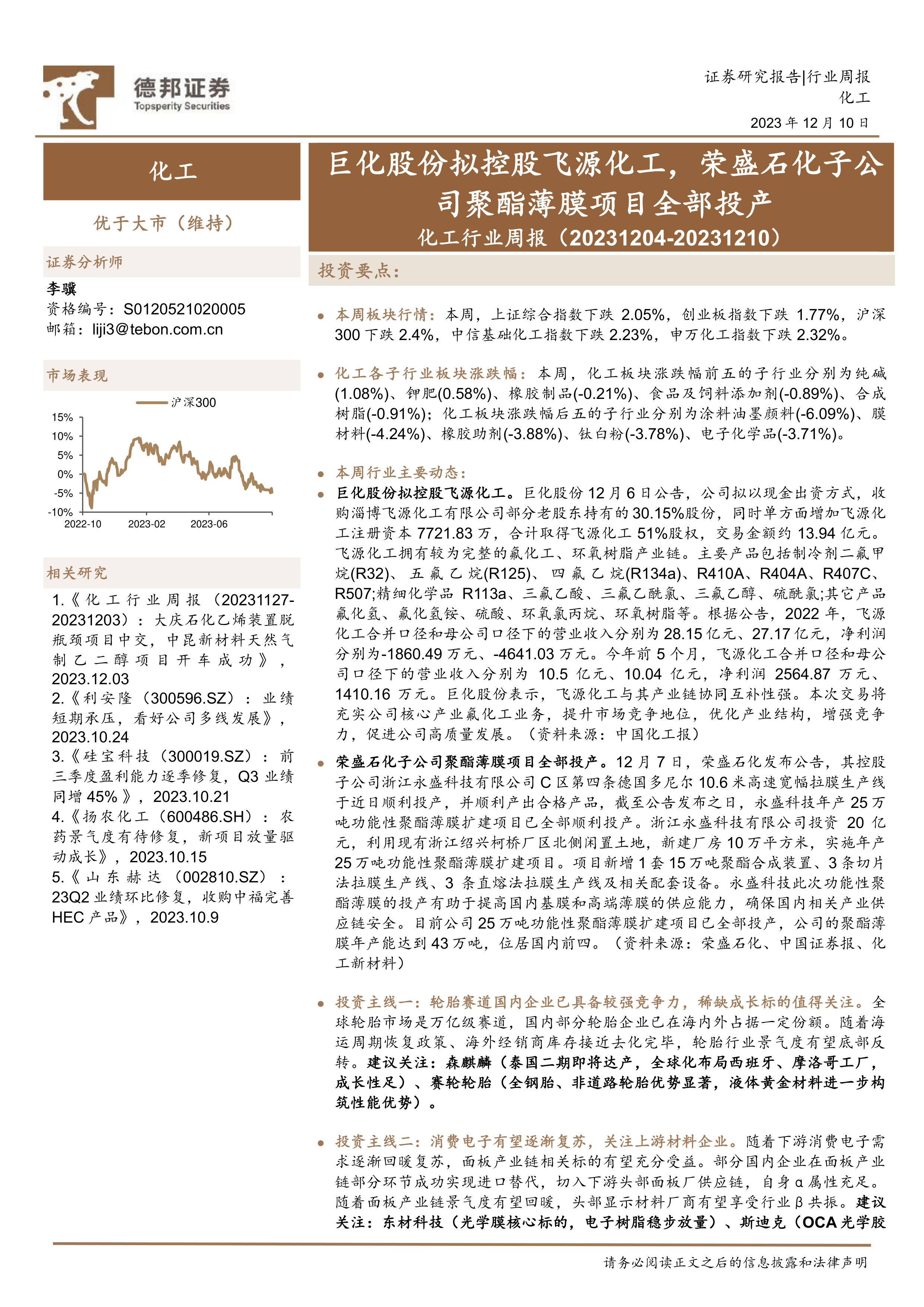 化工行业周报:巨化股份拟控股飞源化工,荣盛石化子公司聚酯薄膜项目全部投产