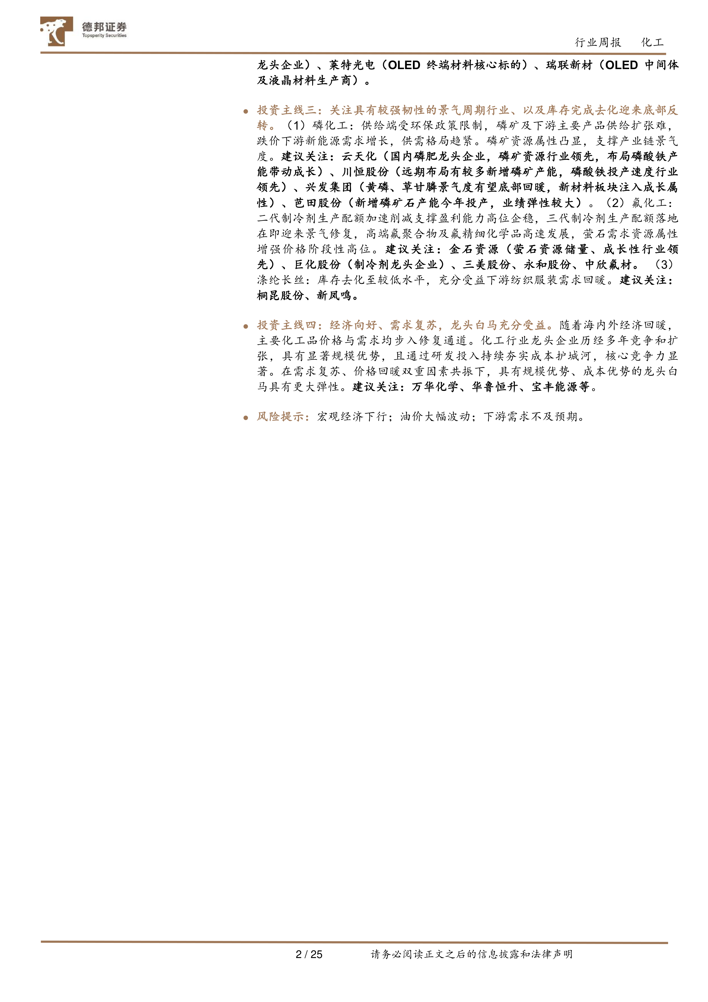 投资主线三:关注具有较强韧性的景气周期行业、以及库存完成去化迎来底部反转。(1)磷化工:供给端受环保政策限制,磷矿及下游主要产品供给扩张难,跌价下游新能源需求增长,供需格局趋紧。磷矿资源属性凸显,支撑产业链景气度。建议关注:云天化(国内磷肥龙头企业,磷矿资源行业领先,布局磷酸铁产能带动成长)、川恒股份(远期布局有较多新增磷矿产能,磷酸铁投产速度行业领先)、兴发集团(黄磷、草甘膦景气度有望底部回暖,新材料板块注入成长属性)、芭田股份(新增磷矿石产能今年投产,业绩弹性较大)。(2)氟化工:二代制冷剂生产配额加速削减支撑盈利能力高位企稳,三代制冷剂生产配额落地在即迎来景气修复,高端氟聚合物及氟精细化学品高速发展,萤石需求资源属性增强价格阶段性高位。建议关注:金石资源(萤石资源储量、成长性行业领先)、巨化股份(制冷剂龙头企业)、三美股份、永和股份、中欣氟材。(3)涤纶长丝:库存去化至较低水平,充分受益下游纺织服装需求回暖。建议关注:桐昆股份、新凤鸣。