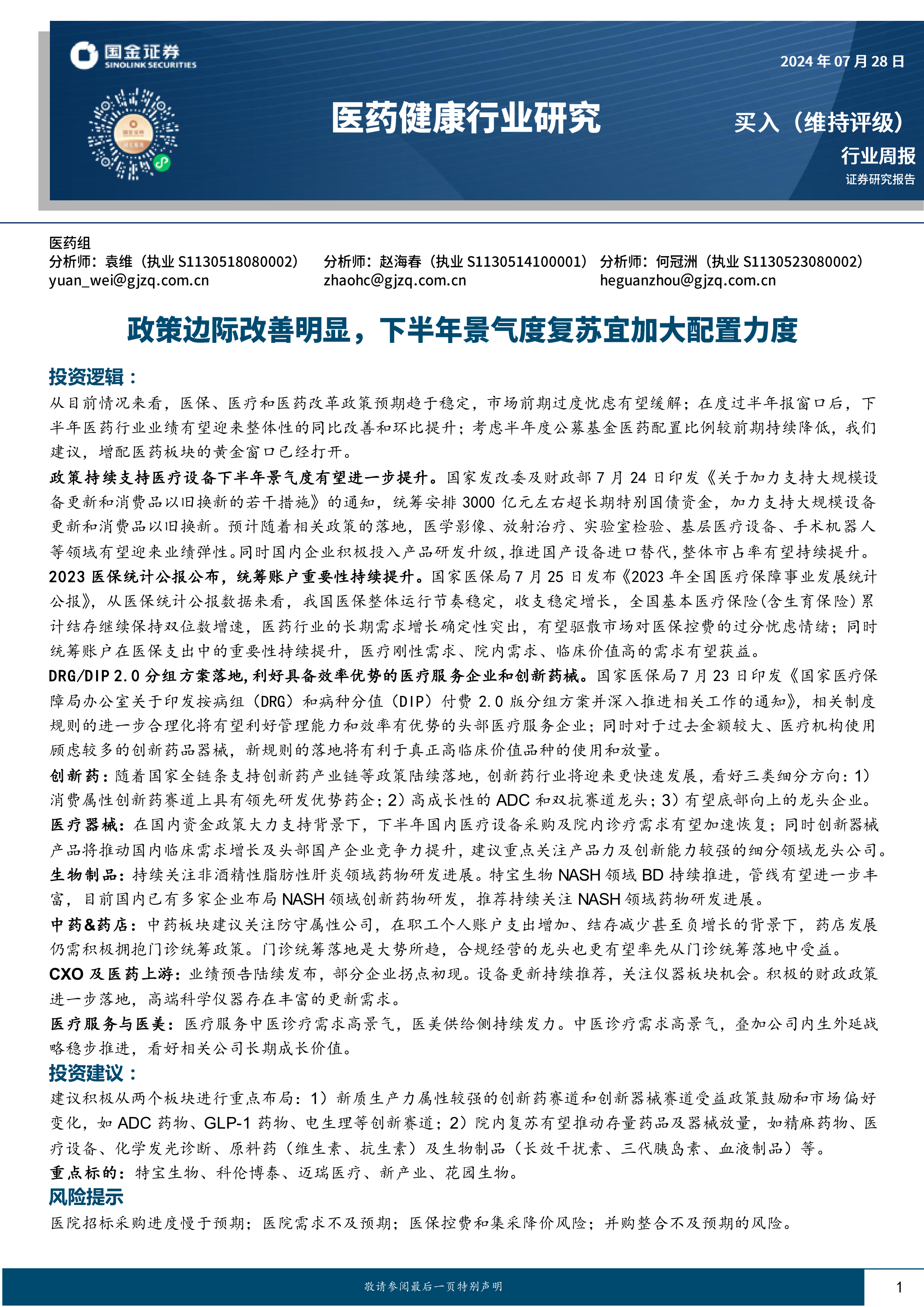 本报告的核心观点是:中国医药行业正经历政策边际改善,下半年业绩有望提升,增配医药板块的黄金窗口已经打开。 具体而言,报告分析了利好医药行业的政策因素(医保政策趋稳、医疗设备更新政策支持、DRG/DIP 2.0落地),以及创新药、医疗器械、生物制品等细分领域的市场机遇和投资建议。 报告同时指出,需关注医院招标采购进度、医院需求、医保控费和集采降价以及并购整合等风险。