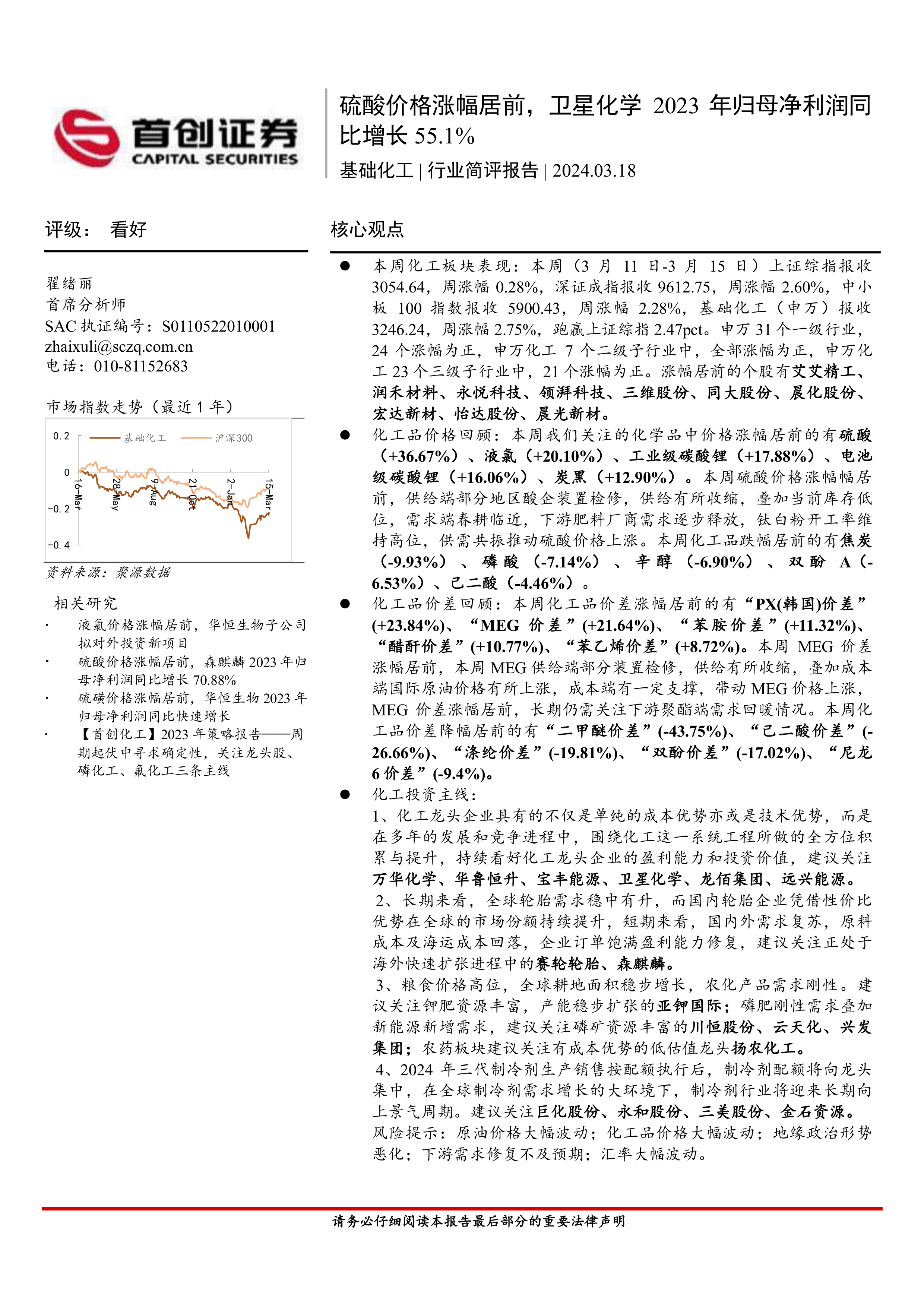 本报告基于市场数据和公开信息,对本周基础化工行业的表现进行了全面分析。硫酸价格的显著上涨是本周行业表现强劲的重要驱动因素,但同时也要关注化工品价格和价差的波动风险。报告建议投资者关注化工龙头企业、轮胎企业、农化产品以及制冷剂行业,并密切关注市场变化和风险提示。 报告中提供的图表和数据为投资者提供了丰富的参考信息,有助于投资者更好地理解市场动态并做出投资决策。
