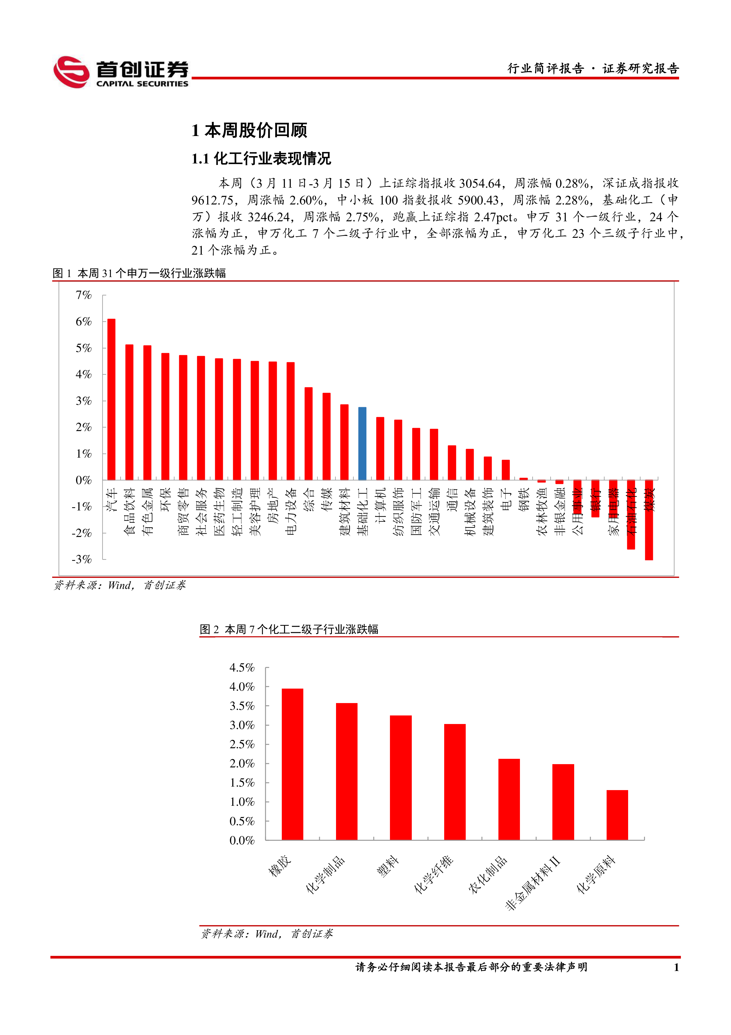 本周化工板块表现:本周(3月11日-3月15日)上证综指报收3054.64,周涨幅0.28%,深证成指报收9612.75,周涨幅2.60%,中小板100指数报收5900.43,周涨幅2.28%,基础化工(申万)报收3246.24,周涨幅2.75%,跑赢上证综指2.47pct。申万31个一级行业,24个涨幅为正,申万化工7个二级子行业中,全部涨幅为正,申万化工23个三级子行业中,21个涨幅为正。涨幅居前的个股有艾艾精工、润禾材料、永悦科技、领湃科技、三维股份、同大股份、晨化股份、宏达新材、怡达股份、晨光新材。
