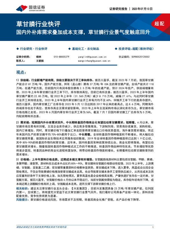供给端新增产能有限,环保政策趋严导致行业集中度提高,上半年开工率低、库存高位,但近期已有所改善。需求端,短期国内外补库需求回升,中长期我国转基因作物商业化有望大幅拉动草甘膦需求。