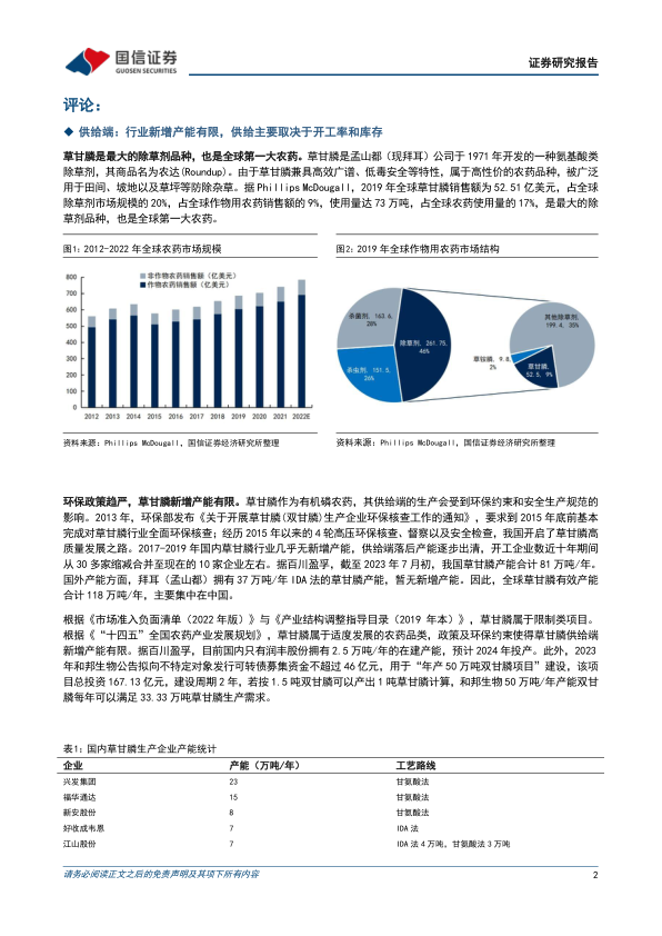 本报告从供给端、需求端和价格端三个方面分析了草甘膦行业的现状和未来走势。