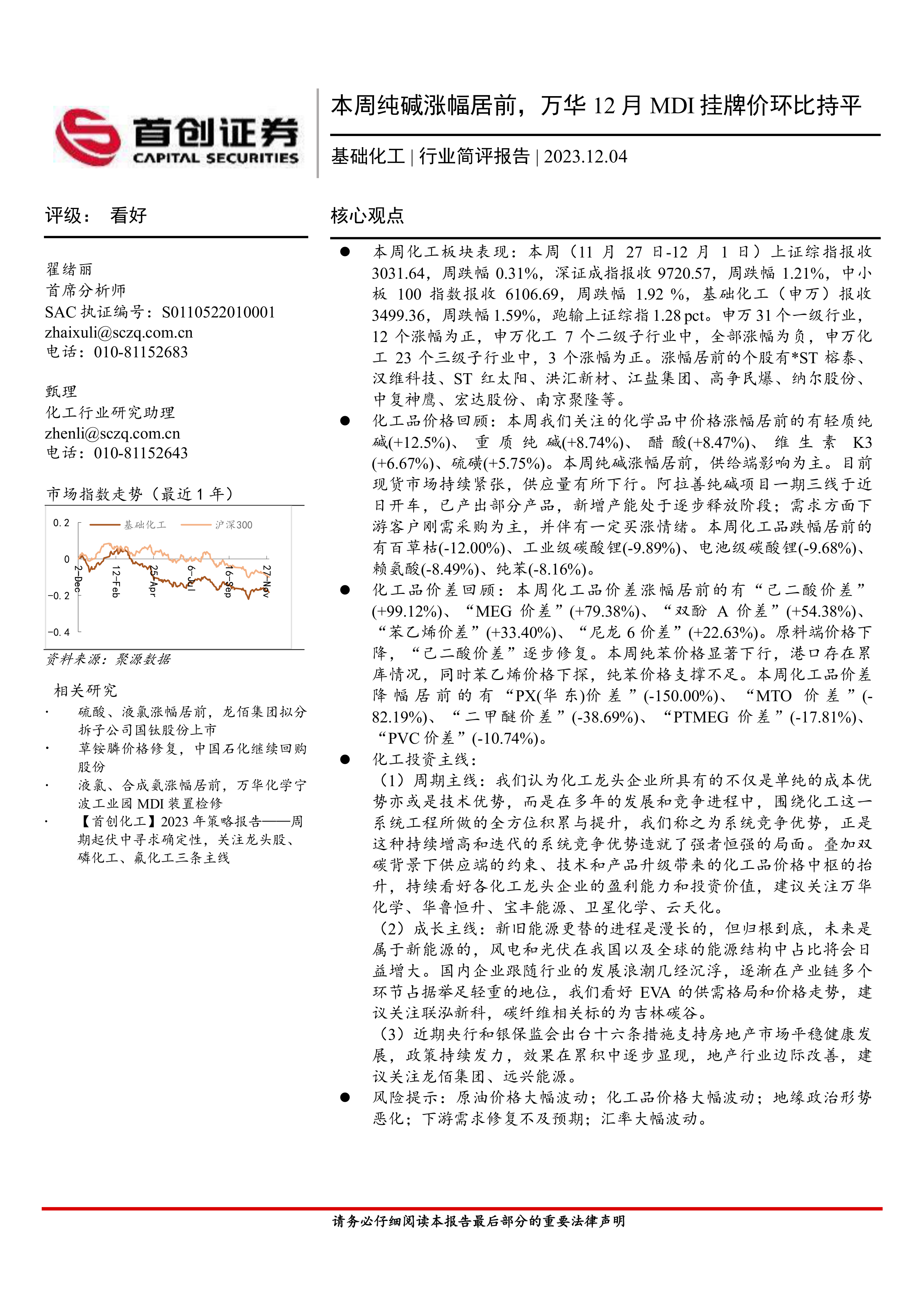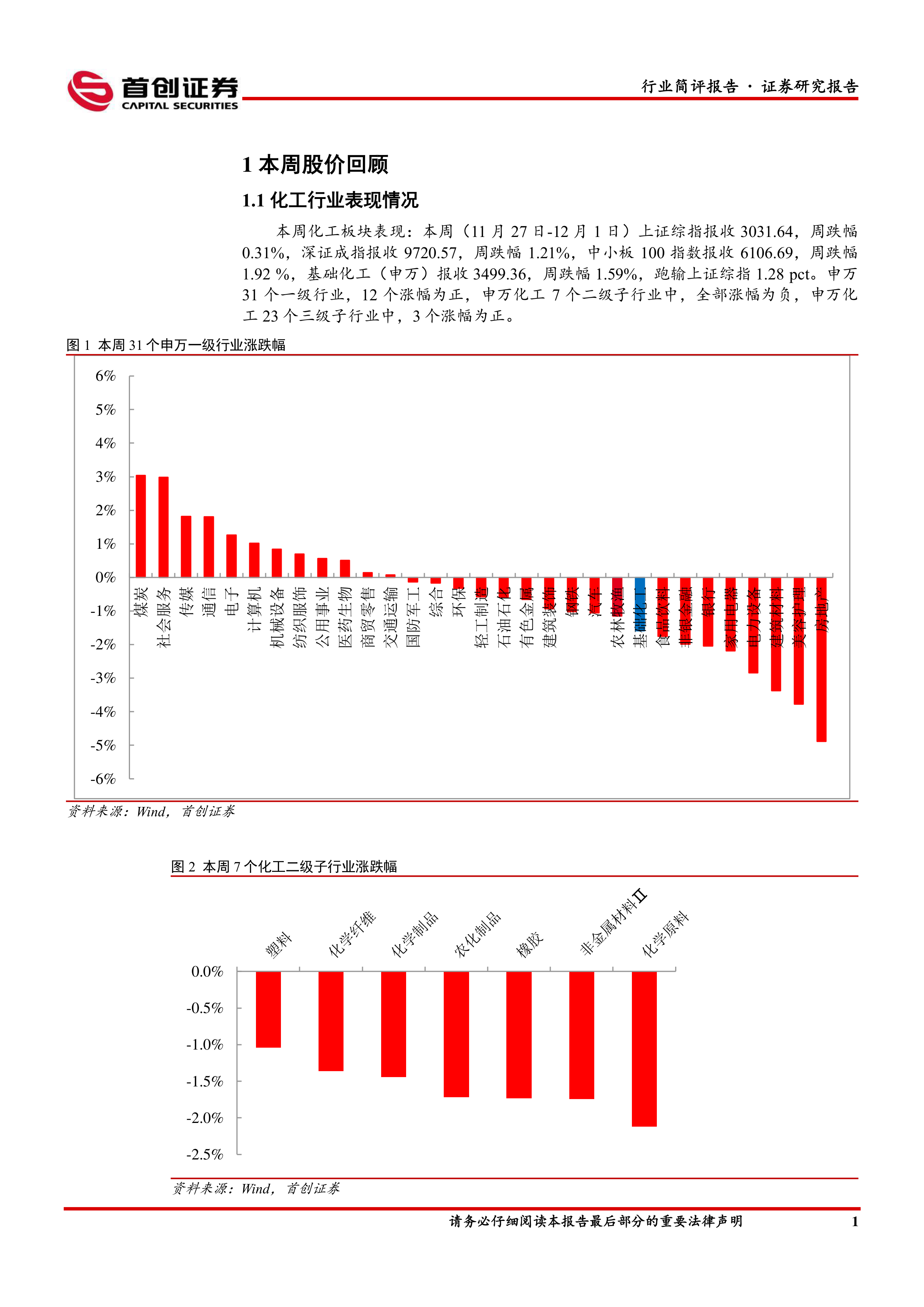 本报告的核心观点是:本周(11月27日-12月1日)基础化工板块整体表现弱于大盘,但部分化工品价格涨幅显著,主要受供给端影响。投资方面,建议关注具备系统竞争优势的化工龙头企业以及受益于新能源和房地产政策利好的相关标的。