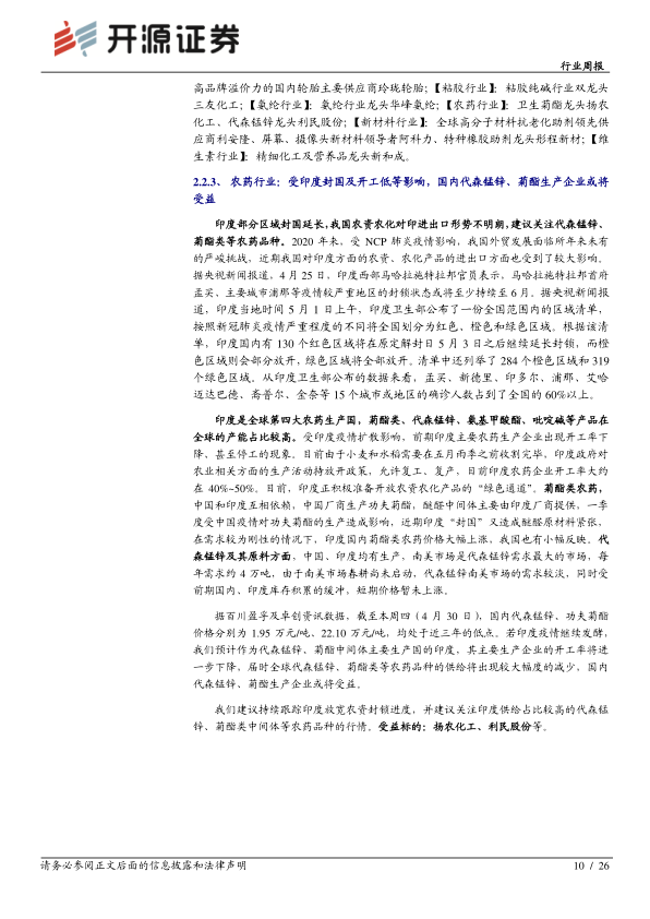 报告分析了印度封国对农药行业的影响,指出国内代森锰锌和菊酯类农药生产企业或将受益。