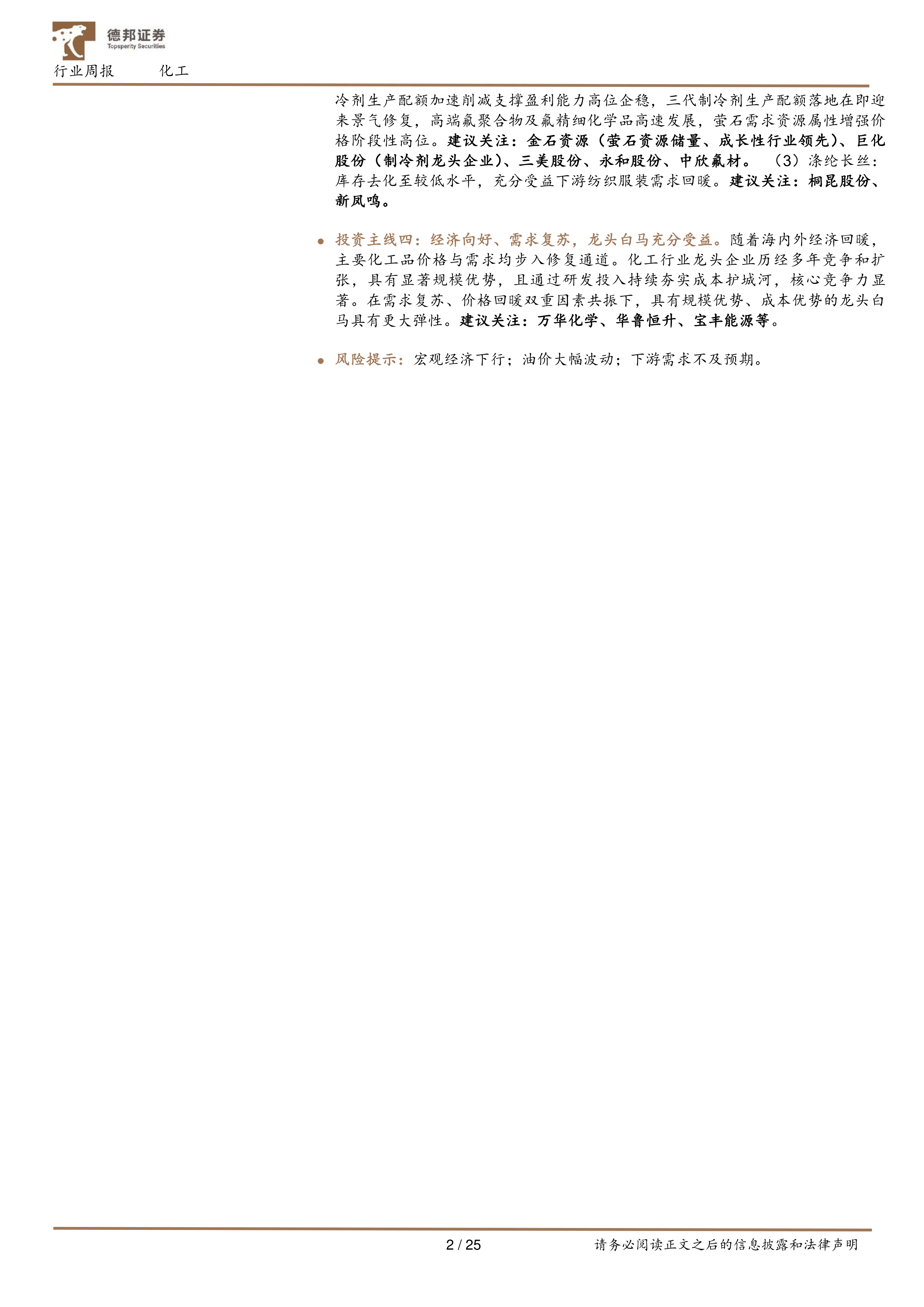 投资主线三:关注具有较强韧性的景气周期行业、以及库存完成去化迎来底部反转。(1)磷化工:供给端受环保政策限制,磷矿及下游主要产品供给扩张难,跌价下游新能源需求增长,供需格局趋紧。磷矿资源属性凸显,支撑产业链景气度。建议关注:云天化(国内磷肥龙头企业,磷矿资源行业领先,布局磷酸铁产能带动成长)、川恒股份(远期布局有较多新增磷矿产能,磷酸铁投产速度行业领先)、兴发集团(黄磷、草甘膦景气度有望底部回暖,新材料板块注入成长属性)、芭田股份(新增磷矿石产能已投产,业绩弹性较大)。(2)氟化工:二代制冷剂生产配额加速削减支撑盈利能力高位企稳,三代制冷剂生产配额落地在即迎来景气修复,高端氟聚合物及氟精细化学品高速发展,萤石需求资源属性增强价格阶段性高位。建议关注:金石资源(萤石资源储量、成长性行业领先)、巨化股份(制冷剂龙头企业)、三美股份、永和股份、中欣氟材。(3)涤纶长丝:库存去化至较低水平,充分受益下游纺织服装需求回暖。建议关注:桐昆股份、新凤鸣。
