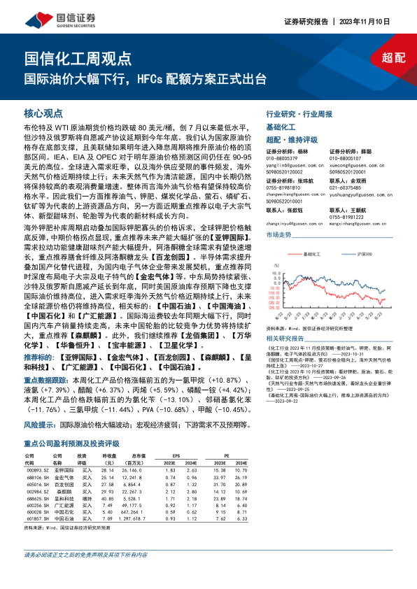 国信化工周观点:国际油价大幅下行,HFCs配额方案正式出台