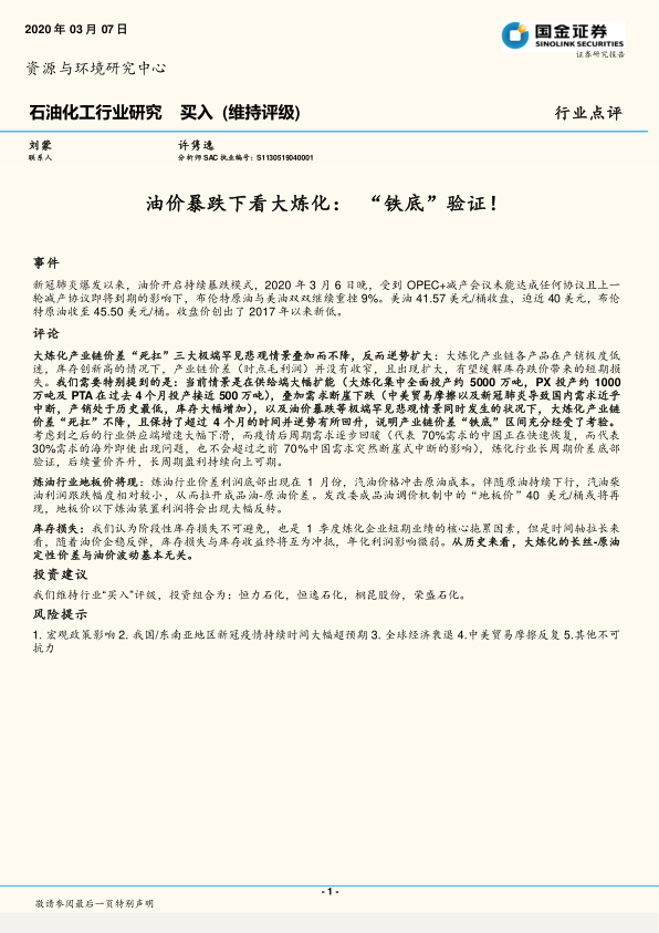 本报告通过对油价暴跌背景下大炼化行业产业链价差、各环节利润、库存损失等因素的深入分析,得出结论:尽管面临诸多挑战,但大炼化行业已触底,长周期盈利向上可期。中国内需的快速恢复将成为行业复苏的重要驱动力。报告维持对石化行业的“买入”评级,并推荐了四家公司作为投资组合。 然而,报告也指出了宏观政策、疫情持续时间、全球经济衰退、中美贸易摩擦等潜在风险。投资者需谨慎评估风险,并结合自身情况做出投资决策。