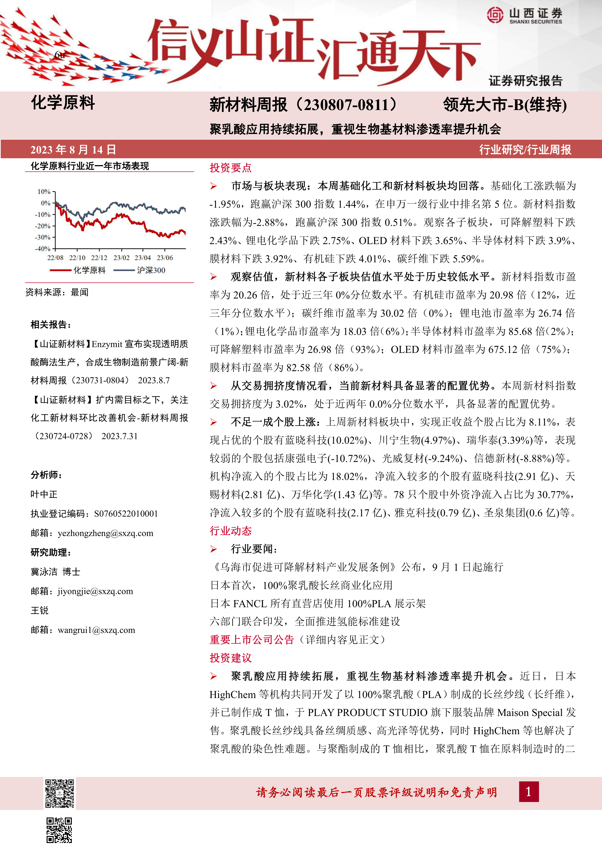新材料周报:聚乳酸应用持续拓展,重视生物基材料渗透率提升机会