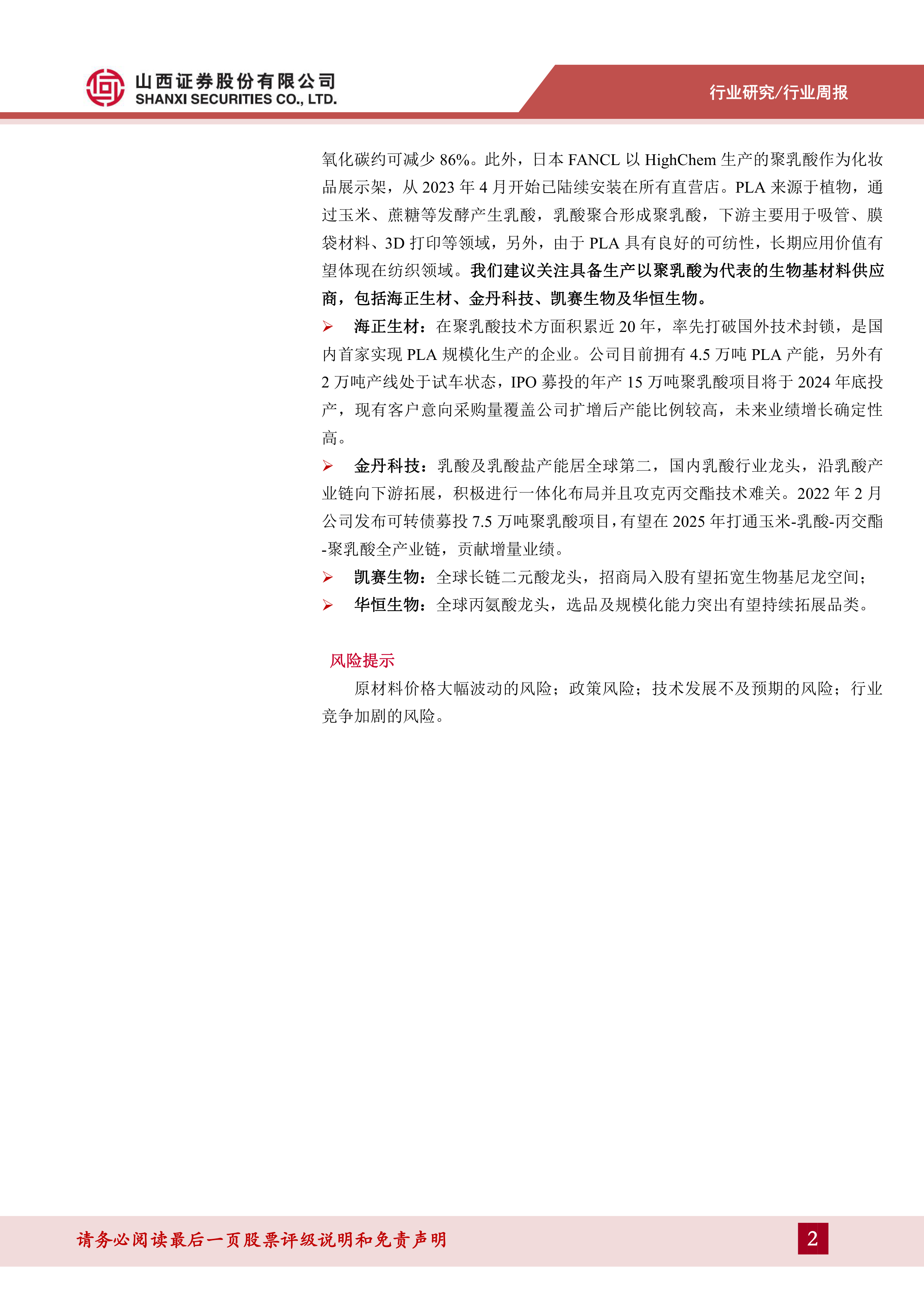 聚乳酸应用持续拓展,重视生物基材料渗透率提升机会。近日,日本HighChem等机构共同开发了以100%聚乳酸(PLA)制成的长丝纱线(长纤维),并已制作成T恤,于PLAYPRODUCTSTUDIO旗下服装品牌MaisonSpecial发售。聚乳酸长丝纱线具备丝绸质感、高光泽等优势,同时HighChem等也解决了聚乳酸的染色性难题。与聚酯制成的T恤相比,聚乳酸T恤在原料制造时的二氧化碳约可减少86%。此外,日本FANCL以HighChem生产的聚乳酸作为化妆品展示架,从2023年4月开始已陆续安装在所有直营店。PLA来源于植物,通过玉米、蔗糖等发酵产生乳酸,乳酸聚合形成聚乳酸,下游主要用于吸管、膜袋材料、3D打印等领域,另外,由于PLA具有良好的可纺性,长期应用价值有望体现在纺织领域。我们建议关注具备生产以聚乳酸为代表的生物基材料供应商,包括海正生材、金丹科技、凯赛生物及华恒生物。