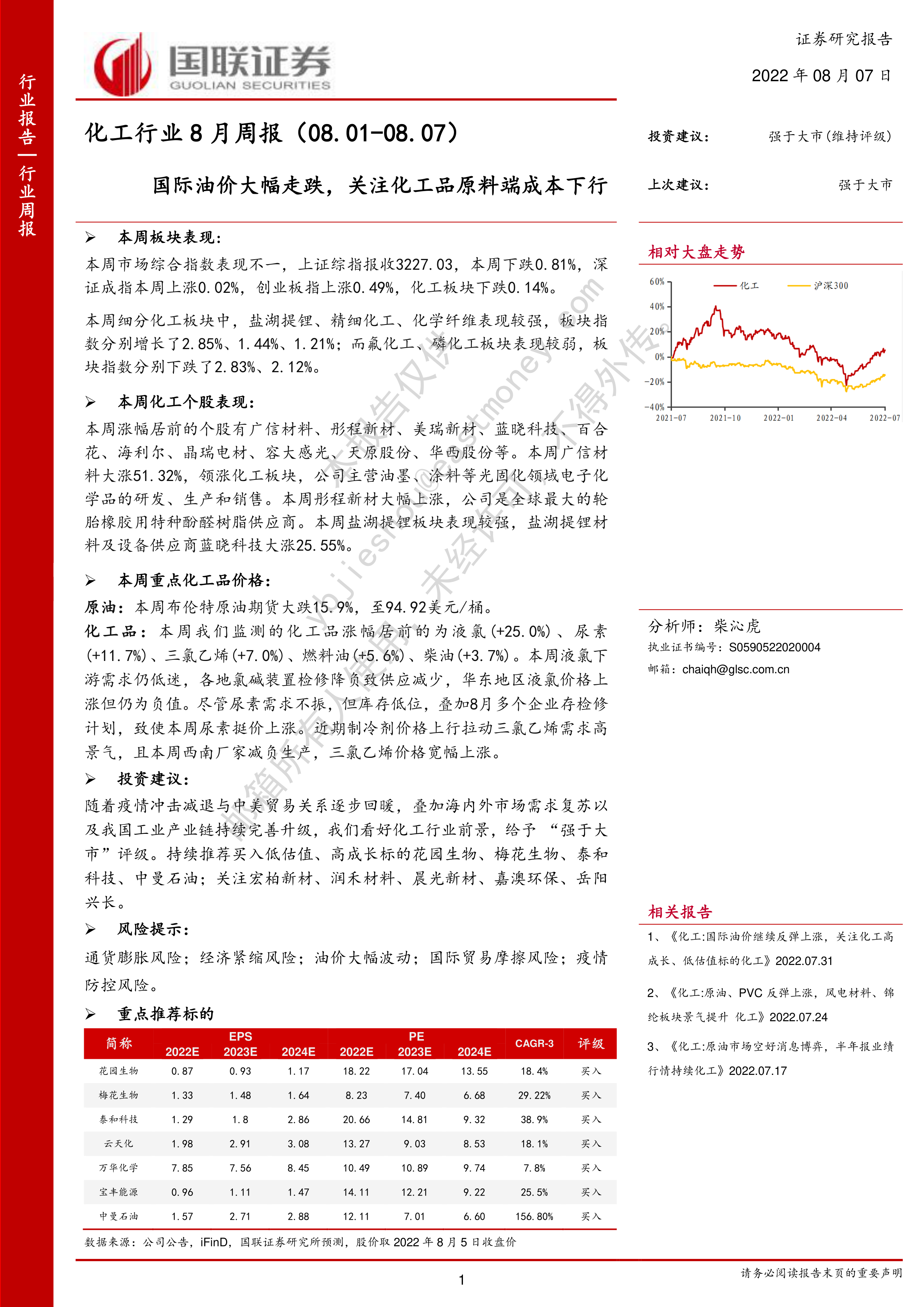 化工行业8月周报:国际油价大幅走跌,关注化工品原料端成本下行
