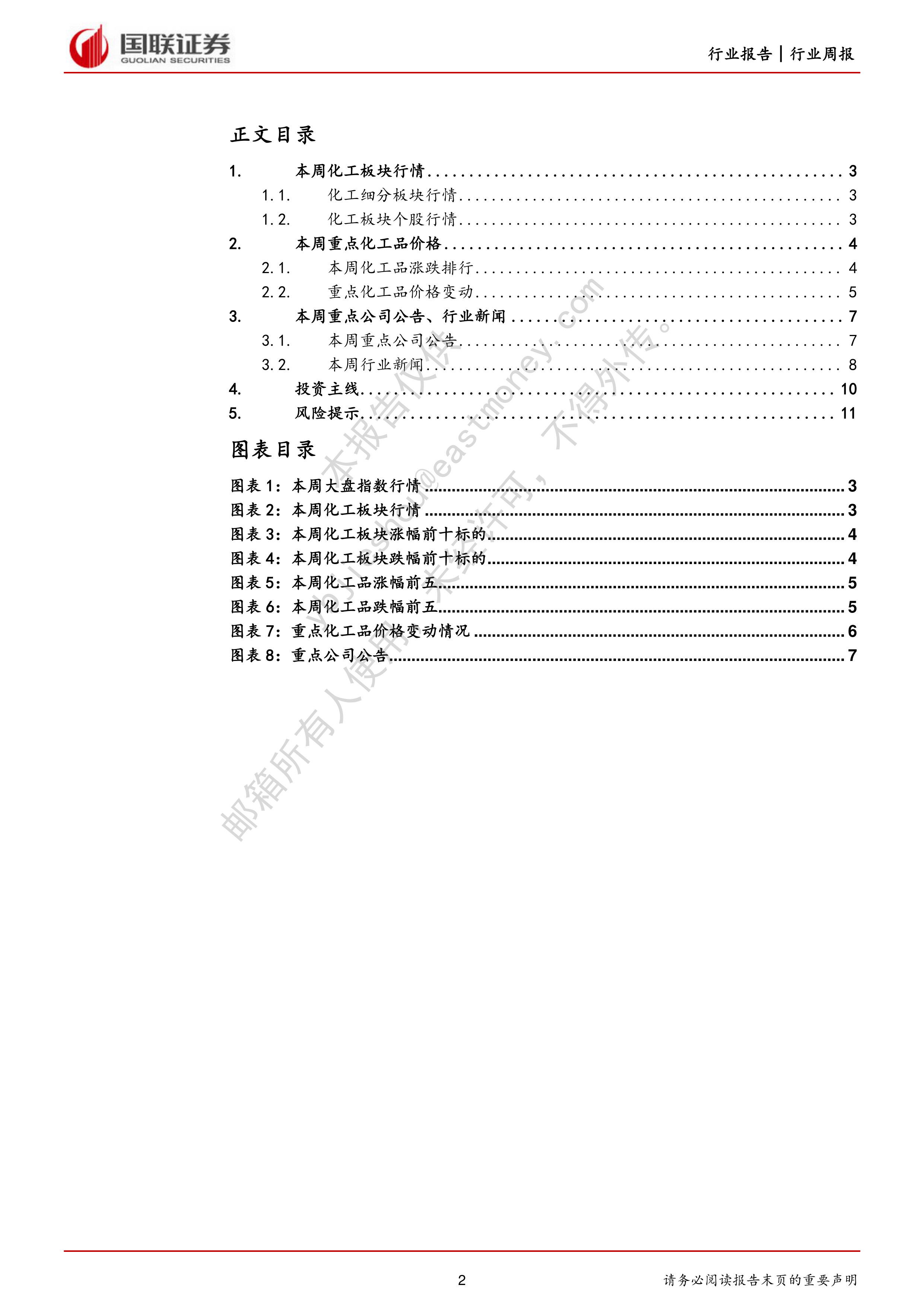 本报告对本周化工行业市场表现进行了全面分析,涵盖了板块行情、个股行情、化工品价格、公司公告以及行业新闻等多个方面。报告指出,本周化工板块表现分化,部分板块表现强劲,部分板块表现疲软。国际原油价格下跌对化工品成本造成下行压力。基于宏观经济环境和行业发展趋势,报告维持对化工行业“强于大市”的评级,并推荐了部分具有投资价值的标的,同时提醒投资者注意行业风险。 报告数据主要来源于Wind、百川盈孚以及国联证券研究所的预测,投资者需谨慎参考。