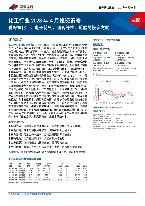 化工行业4月投资观点:3月国际油价先抑后扬,本月WTI原油均价格为73.27美元/桶,较上月均价下跌3.59美元;布伦特原油均价为79.18美元/桶,较上月均价下跌4.36美元。随着美联储联合欧洲央行救市,市场情绪逐渐回稳,银行业危机引发的担忧有所消退,各产油国延长减产计划,存供应收紧迹象,原油市场供需层面仍支撑。近期,我们重点看好氟化工、电子特气、膳食纤维、芳纶、UHMWPE、轮胎、光伏胶膜材料、磷化工等投资方向。国产替代与国际化发展趋势,为国内电子特种气体企业带来发展契机,我们建议关注【华特气体】、【凯美特气】、【昊华科技】等。膳食纤维随着健康概念推广,行业渗透率稳步增长,【百龙创园】公司的膳食纤维产量在全球生产商中占比约为12.45%,是全球第二大生产商。供给侧结构性改革不断深化、配额管理将在立法层面落地、行业竞争格局趋向集中,而下游需求恢复平稳增长,我们看好三代含氟制冷剂有望迎来景气复苏,同时含氟聚合物、氟化液国产化进程提速,推荐【巨化股份】、【三美股份】、【永和股份】等。国际海运费持续下行,同时国内汽车产销量持续走高,海外轮胎需求回暖,同时未来中国轮胎的比较竞争力优势将持续扩大全球市场份额,推荐【赛轮轮胎】和【森麒麟】。间位芳纶方面个体防护装备配备标准的逐步推进;对位芳纶光通信及橡胶领域需求保持旺盛;此外锂电隔膜芳纶涂覆市场需求前景广阔,推荐【泰和新材】。海外地缘冲突背景下,防弹装备需求大幅增长拉动了高端UHMWPE(超过分子量聚乙烯纤维)需求,产品价格今年以来持续上行,同时国内企业中高端产品渗透率继续提升,未来行业有望保持较高景气度,推荐【同益中】。