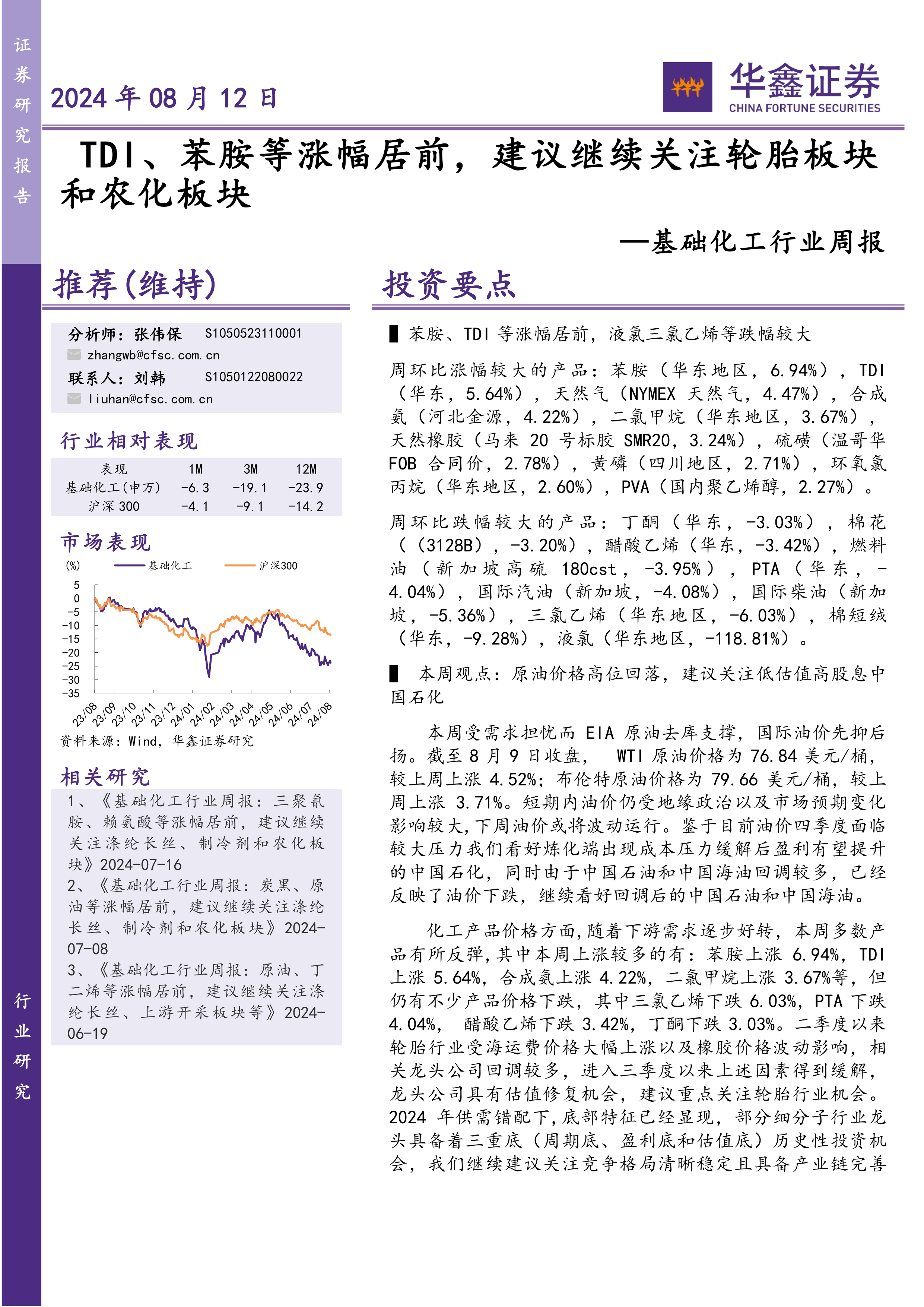 基础化工行业周报:TDI、苯胺等涨幅居前,建议继续关注轮胎板块和农化板块