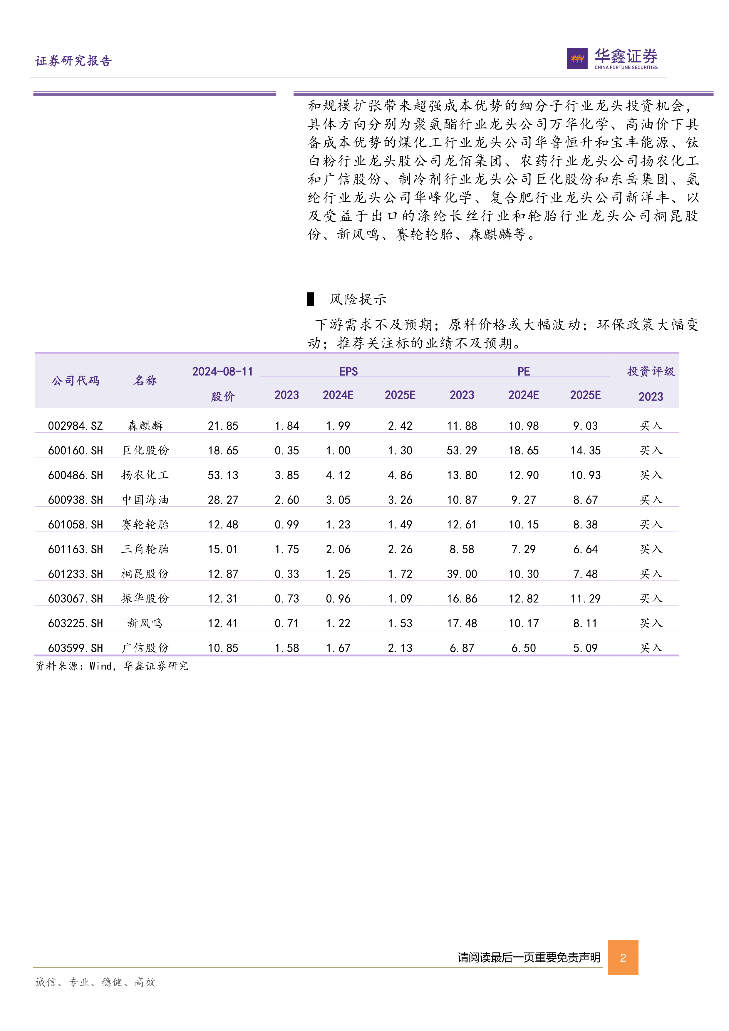 报告最后列出了潜在的投资风险,包括下游需求不及预期、原料价格大幅波动、环保政策大幅变动以及推荐关注标的业绩不及预期等。