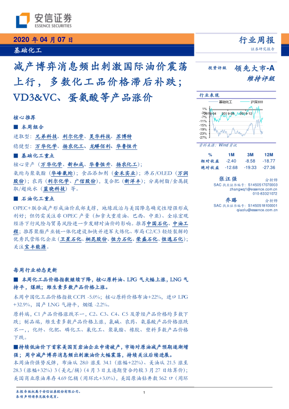 本报告对2020年4月基础化工行业进行了全面分析,涵盖了国际油价走势、化工品价格波动、中国化工业PMI以及重点化工品市场等方面。报告指出,国际油价在减产博弈中震荡上行,但全球宏观经济下行风险和贸易风险仍构成压力。化工品价格分化明显,部分产品因供应紧张而价格上涨,部分产品价格下跌。中国化工业复苏面临挑战,需求低迷和成本塌陷是主要问题。MDI价格受原料成本下降和海外疫情影响而回落,但厂商挺市态度仍在。投资者需关注油价波动、化工品价格波动以及下游复工情况等风险。 报告数据主要基于Wind资讯,并结合安信证券研究团队的分析判断。
