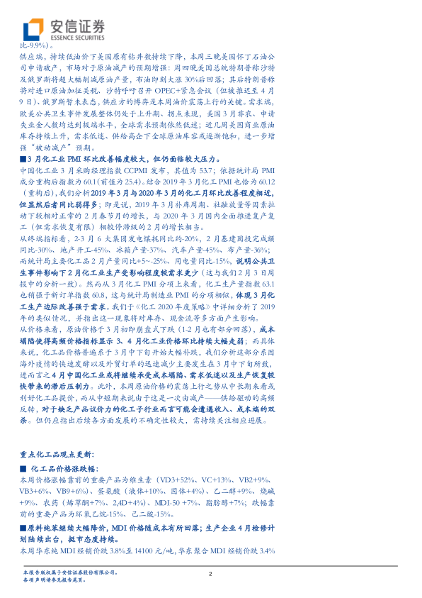 本报告的核心观点是:2020年4月,国际油价在减产博弈消息刺激下震荡上行,但全球宏观经济下行风险和贸易风险仍对油价构成压力。化工品价格整体下跌,部分产品如维生素、蛋氨酸等因供应紧张而价格上涨。中国化工业PMI在3月有所改善,但仍面临成本塌陷、需求低迷的挑战。MDI价格受原料纯苯大幅降价和海外疫情影响而回落,但厂商挺市态度仍在。