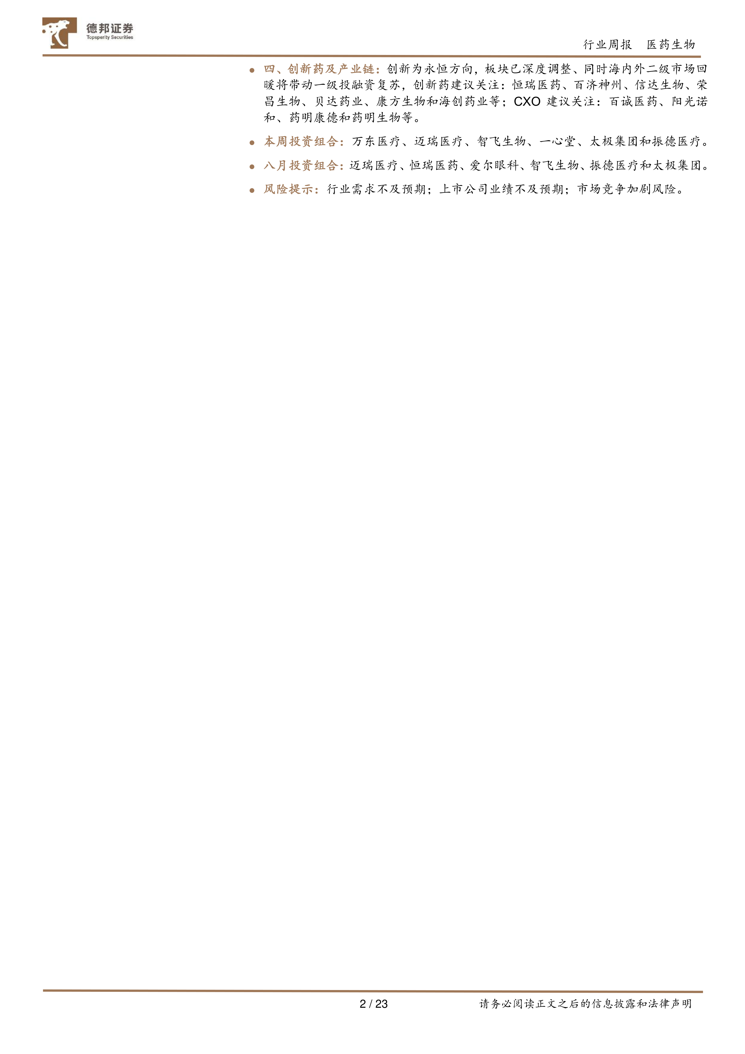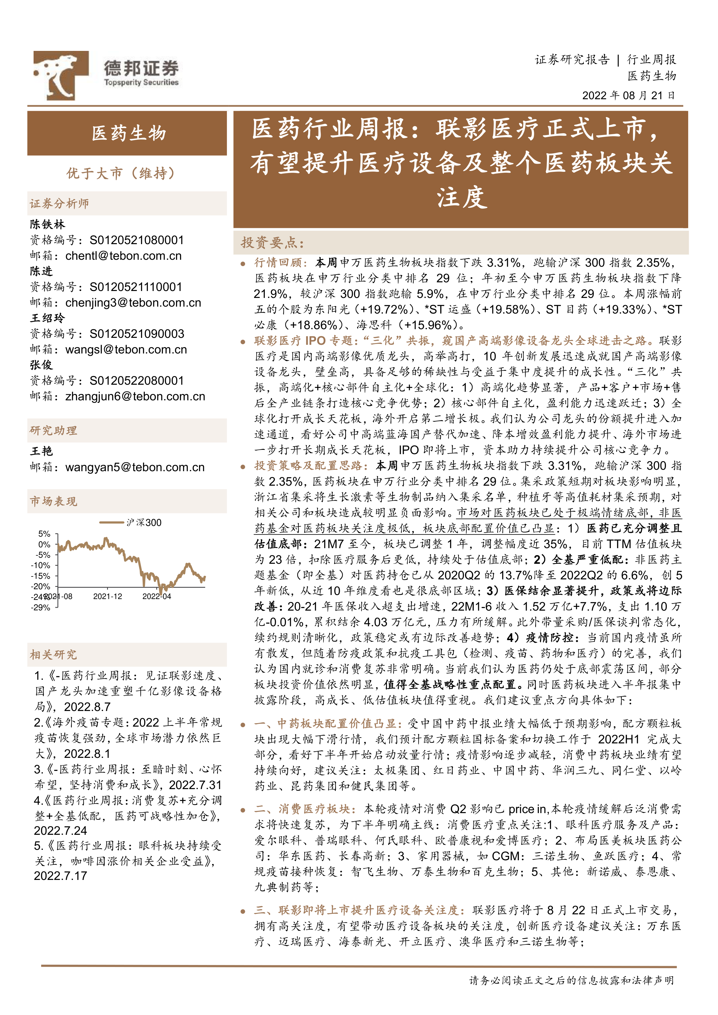 三、联影即将上市提升医疗设备关注度:联影医疗将于8月22日正式上市交易,拥有高关注度,有望带动医疗设备板块的关注度,创新医疗设备建议关注:万东医疗、迈瑞医疗、海泰新光、开立医疗、澳华医疗和三诺生物等;