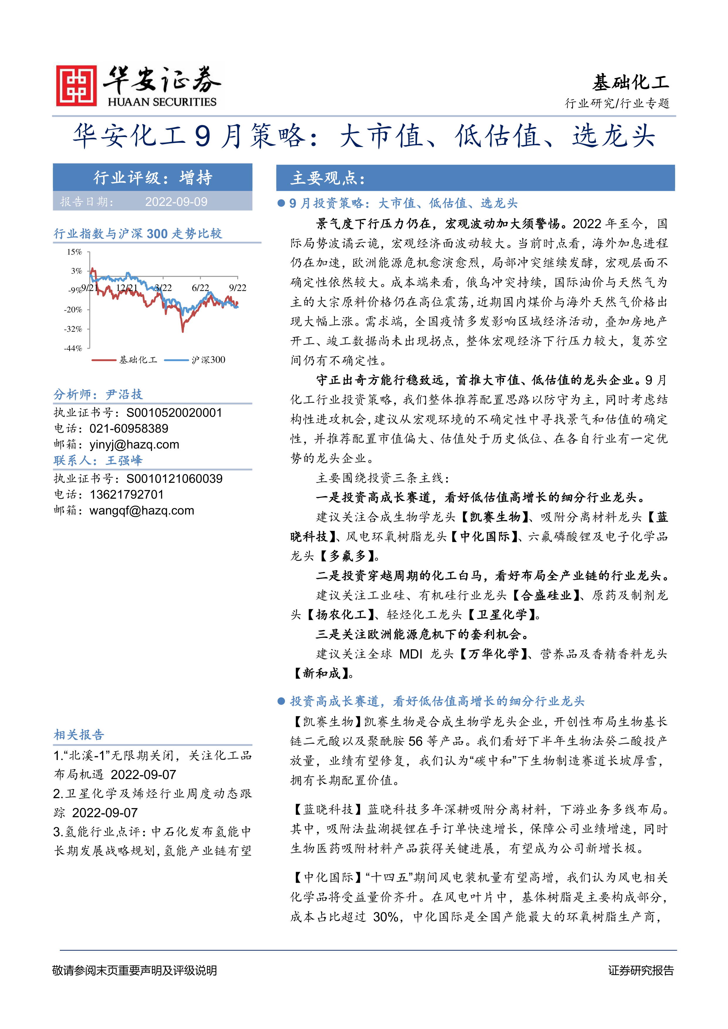 报告首先分析了当前化工行业面临的挑战,包括大宗商品价格高位震荡、宏观经济下行压力以及国内疫情反复等。基于此,报告提出9月份的投资策略应以防守为主,同时寻找结构性进攻机会,重点关注大市值、低估值、行业龙头企业。
