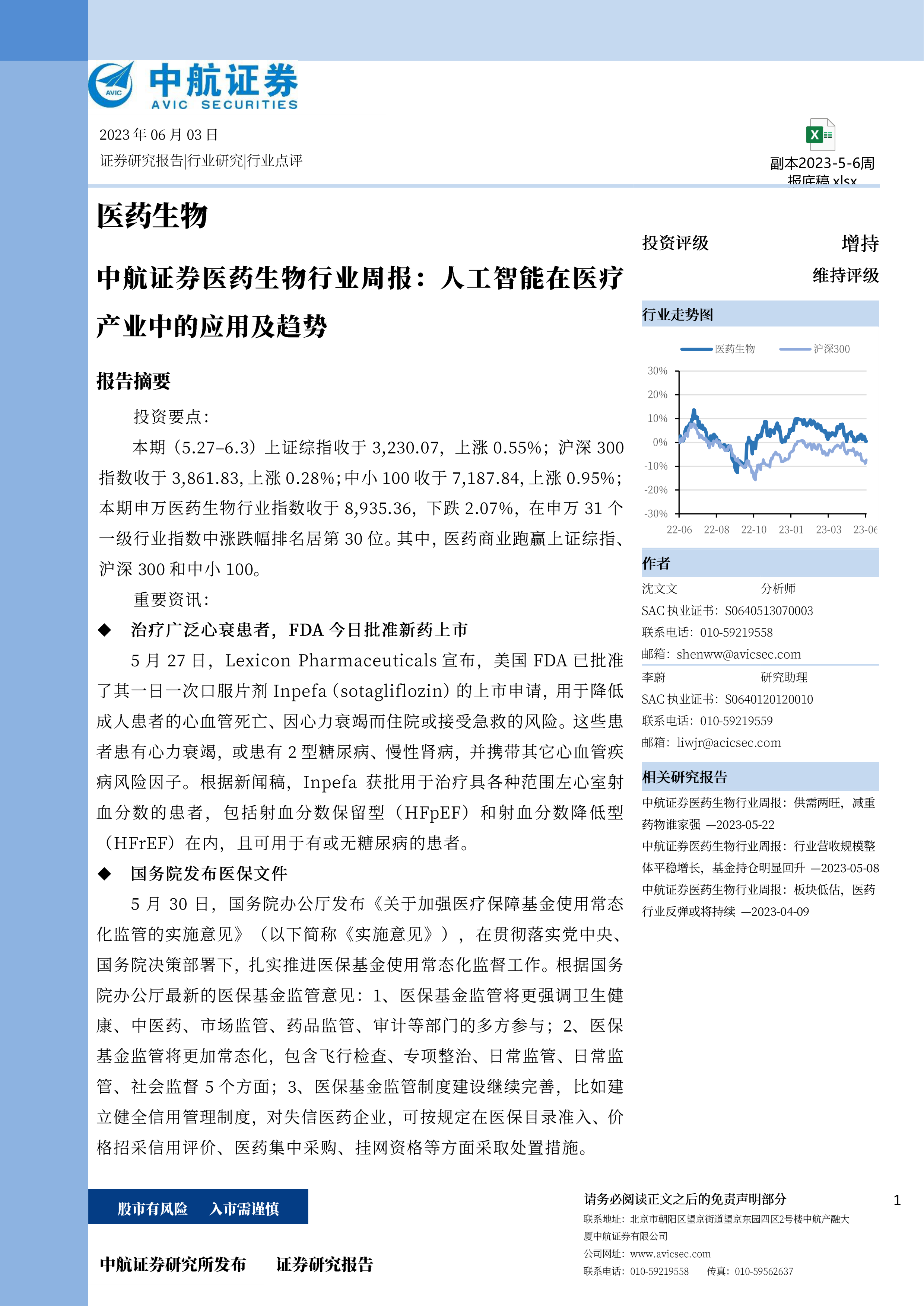 本期(5.27-6.3)上证综指收于3,230.07,上涨0.55%;沪深300指数收于3,861.83,上涨0.28%;中小100收于7,187.84,上涨0.95%;本期申万医药生物行业指数收于8,935.36,下跌2.07%,在申万31个级行业指数中涨跌幅排名居第30位。其中,医药商业跑赢上证综指、沪深300和中小100。