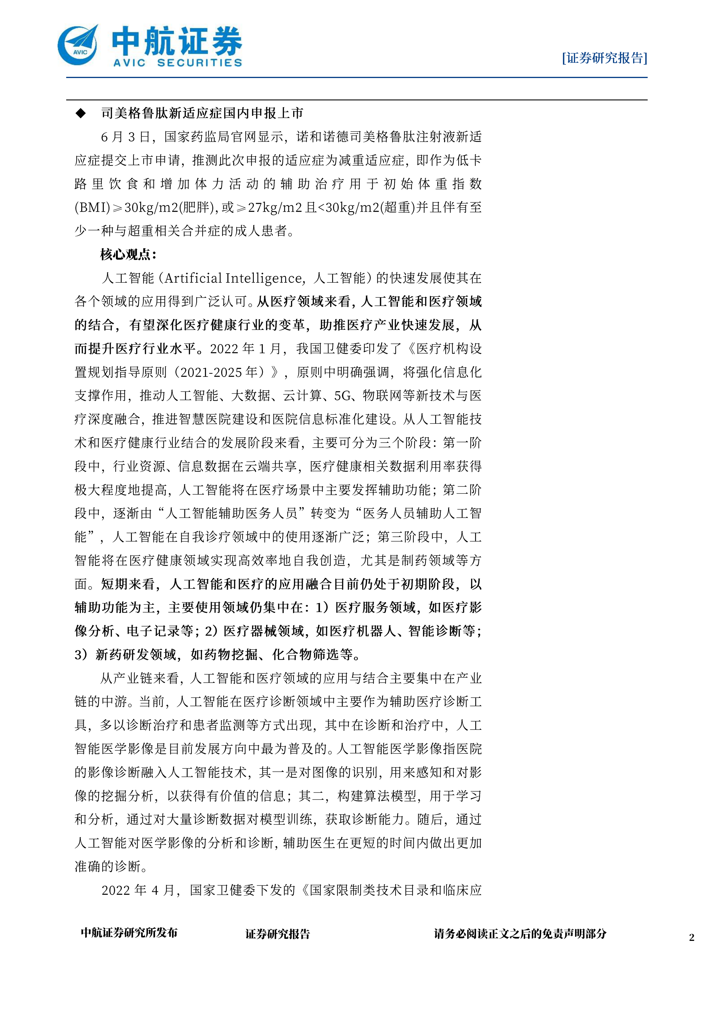 人工智能(Artificial Intelligence,人工智能)的快速发展使其在各个领域的应用得到广泛认可。从医疗领域来看,人工智能和医疗领域的结合,有望深化医疗健康行业的变革,助推医疗产业快速发展,从而提升医疗行业水平。2022年1月,我国卫健委印发了《医疗机构设置规划指导原则(2021-2025年)》,原则中明确强调,将强化信息化支撑作用,推动人工智能、大数据、云计算、5G、物联网等新技术与医疗深度融合,推进智慧医院建设和医院信息标准化建设。从人工智能技术和医疗健康行业结合的发展阶段来看,主要可分为三个阶段:第一阶段中,行业资源、信息数据在云端共享,医疗健康相关数据利用率获得极大程度地提高,人工智能将在医疗场景中主要发挥辅助功能;第二阶段中,逐渐由“人工智能辅助医务人员”转变为“医务人员辅助人工智能”,人工智能在自我诊疗领域中的使用逐渐广泛;第三阶段中,人工智能将在医疗健康领域实现高效率地自我创造,尤其是制药领域等方面。短期来看,人工智能和医疗的应用融合日前仍处于初期阶段,以铺助功能为主,主要使用领域仍集中在:1)医疗服务领域,如医疗影像分析、电子记录等;2)医疗器械领域,如医疗机器人、智能诊断等;3)新药研发领域,如药物挖掘、化合物筛选等。