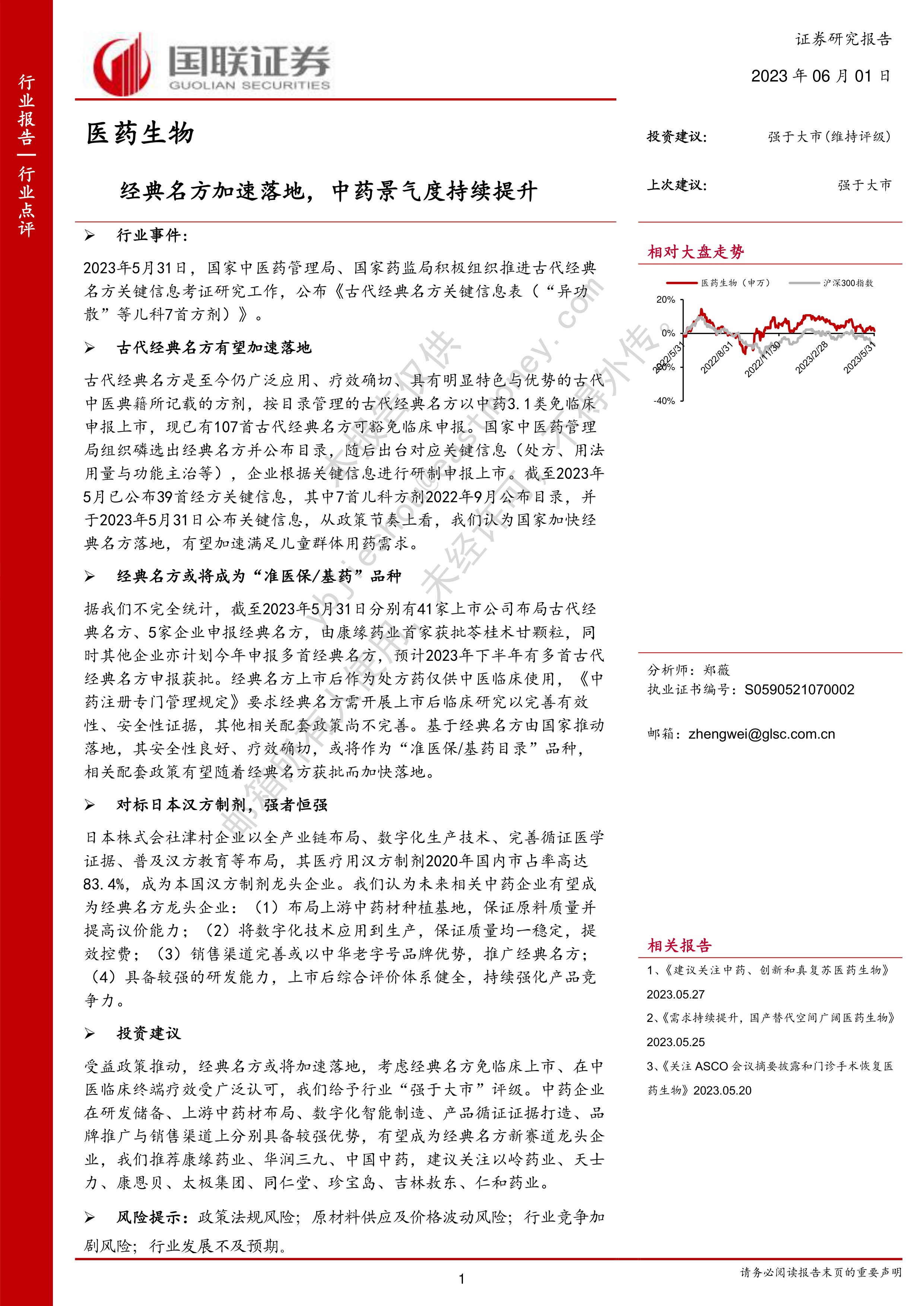 报告首先概述了医药生物行业现状,并重点关注了2023年5月31日国家发布的《古代经典名方关键信息表》(包含7首儿科方剂)这一重要行业事件。该事件标志着国家对经典名方加速落地的政策决心,为行业发展注入新的动力。