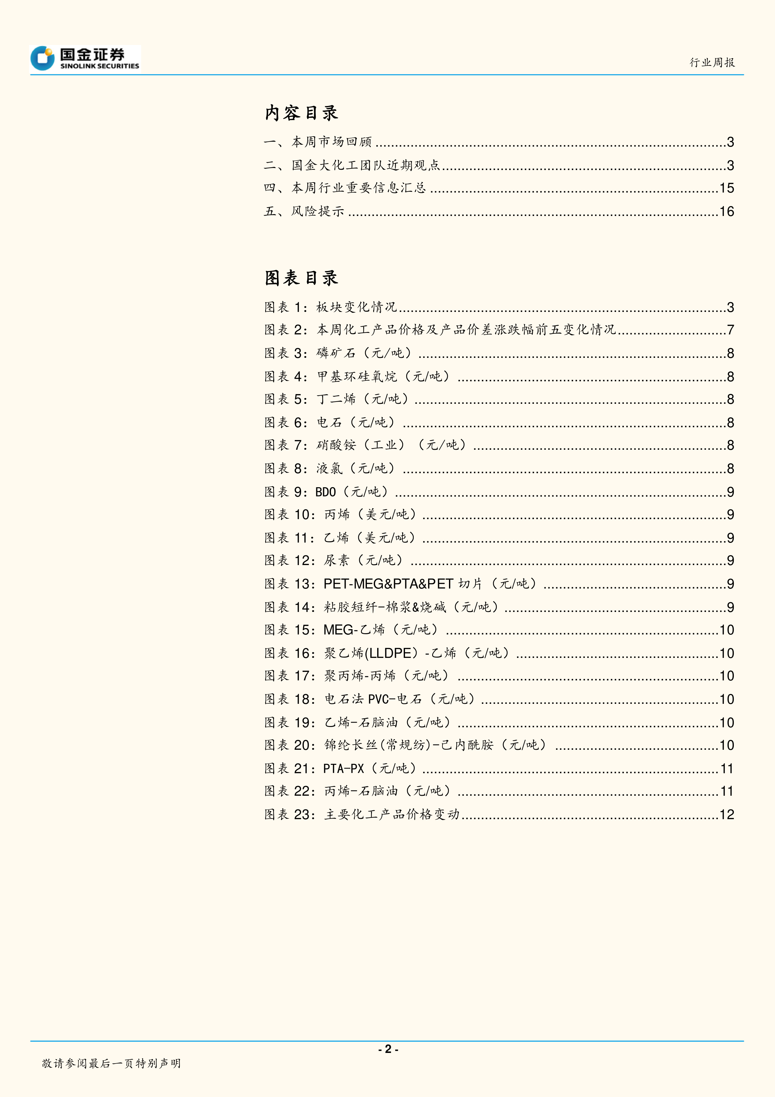 报告详细跟踪了多个子行业的近期情况,包括钛白粉、安赛蜜、三氯蔗糖、甲乙基麦芽酚、醋酸、硫磺、液氯、天然橡胶、PA66、维生素(VA、VE、VD3)、分散染料、DMC、化肥(尿素、磷肥)、煤化工(甲醇、合成氨)、乙二醇、粘胶短纤、氨纶、聚合MDI、纯MDI、PVC糊树脂、环氧丙烷、有机硅DMC、草甘膦、电解液、六氟磷酸锂等。 对于每个子行业,报告分析了供需关系、价格走势、成本变化以及未来预期,并给出了相应的投资建议。 例如,报告预测钛白粉价格将整理运行,安赛蜜价格稳定运行,三氯蔗糖价格走势趋弱,甲乙基麦芽酚价格略有上涨,醋酸价格高位震荡等等。