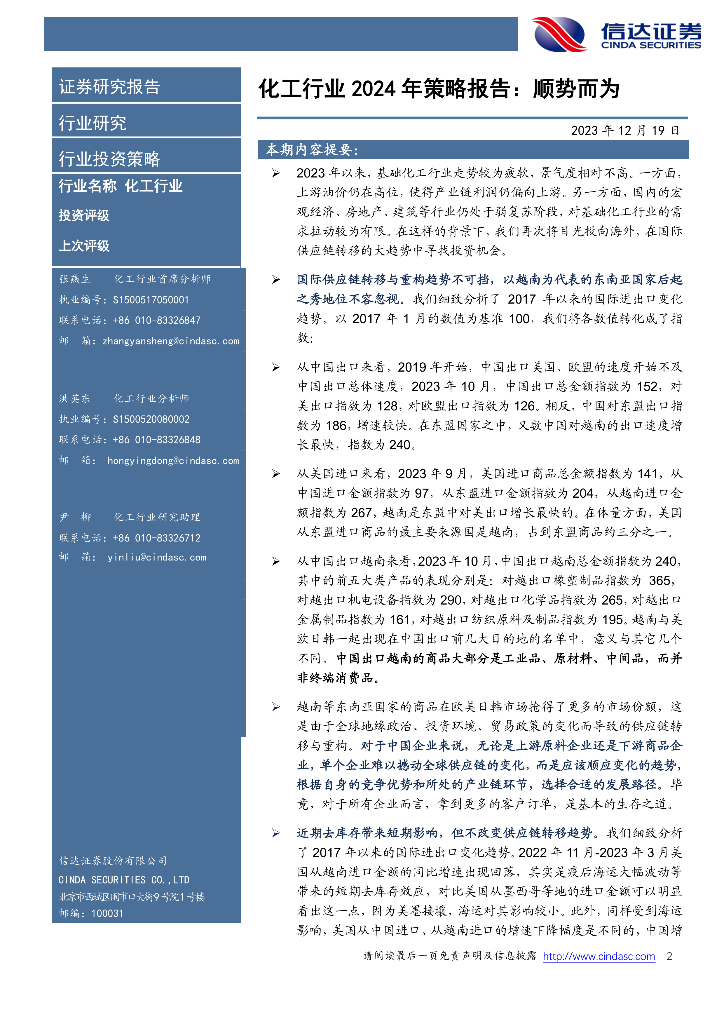 本报告的核心观点是:尽管2024年基础化工行业面临国内需求疲软和上游油价高位等挑战,但全球供应链转移与重构的长期趋势依然强劲,为中国企业提供了新的发展机遇。报告建议中国企业顺应这一趋势,积极布局海外市场,特别是东南亚地区,例如越南,以获取更多订单和更高的利润率。