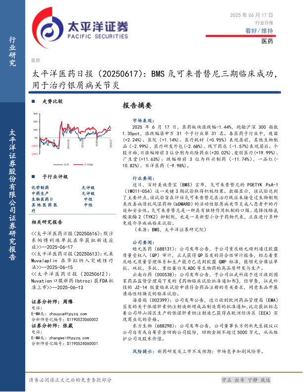 本报告对2025年6月17日医药板块的市场表现进行了分析,指出板块整体表现低迷,但个股表现分化显著,部分细分领域表现强劲,部分则表现不佳。BMS氘可来昔替尼三期临床试验成功为行业带来积极信号。 报告还详细介绍了多家医药公司的近期动态,为投资者提供参考信息。 投资者需密切关注市场变化和公司动态,谨慎投资。 需要注意的是,本报告仅基于公开信息,不构成投资建议,投资者需自行承担投资风险。