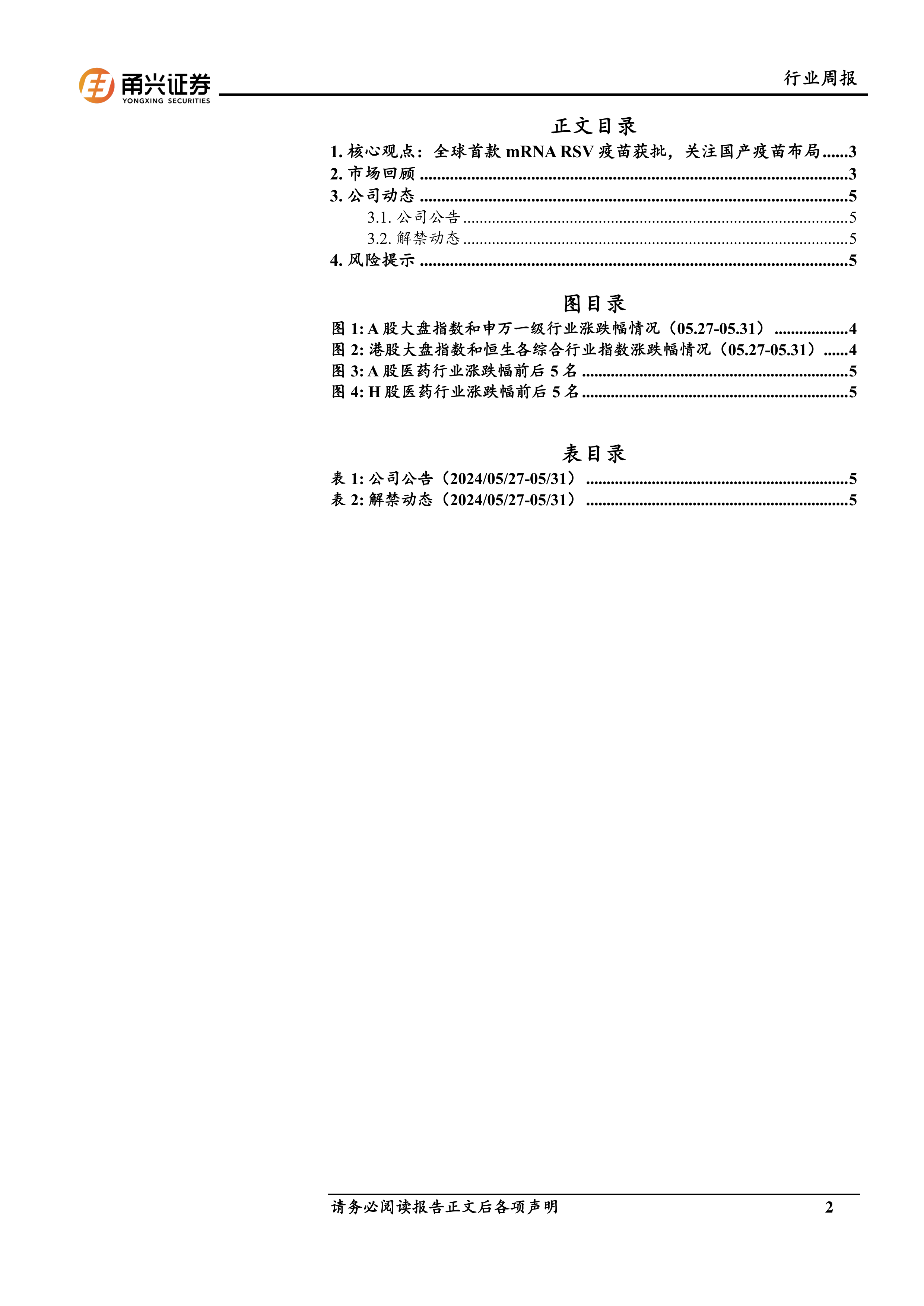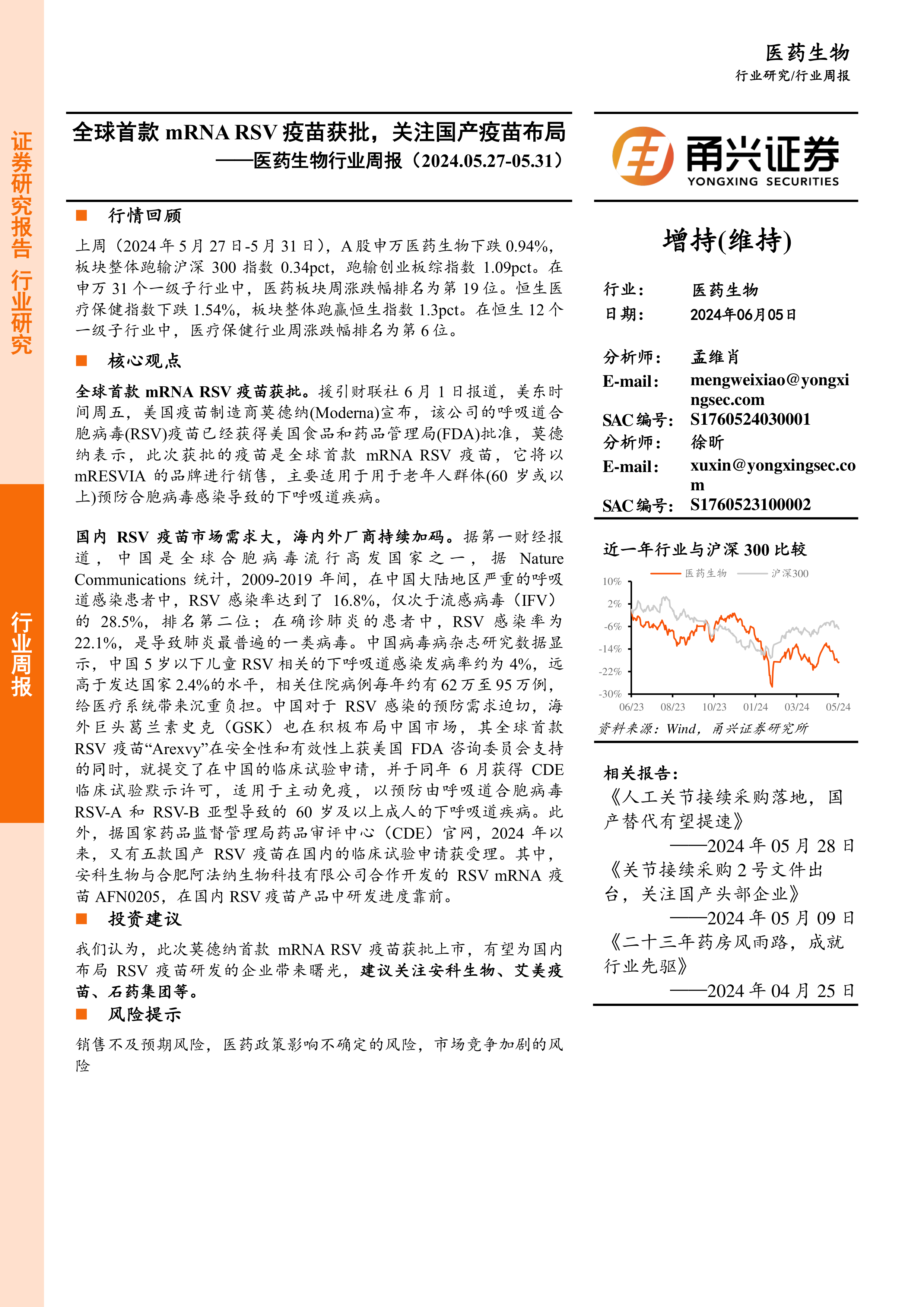 本报告基于莫德纳mRNA RSV疫苗获批的重大事件,分析了全球及中国RSV疫苗市场现状及未来发展趋势。数据显示,中国RSV疫苗市场需求巨大,而国内外厂商都在积极布局。报告认为,莫德纳疫苗的获批将为国内RSV疫苗研发企业带来发展机遇,并推荐了部分值得关注的企业,但同时也提醒投资者注意潜在的市场风险。 报告提供了A股和港股医药生物行业上周的市场表现数据,以及部分上市公司的公告和解禁信息,为投资者提供参考。 然而,报告信息截止日期为2024年5月31日,后续市场变化可能影响报告结论的准确性。 投资者应结合自身情况,谨慎决策。