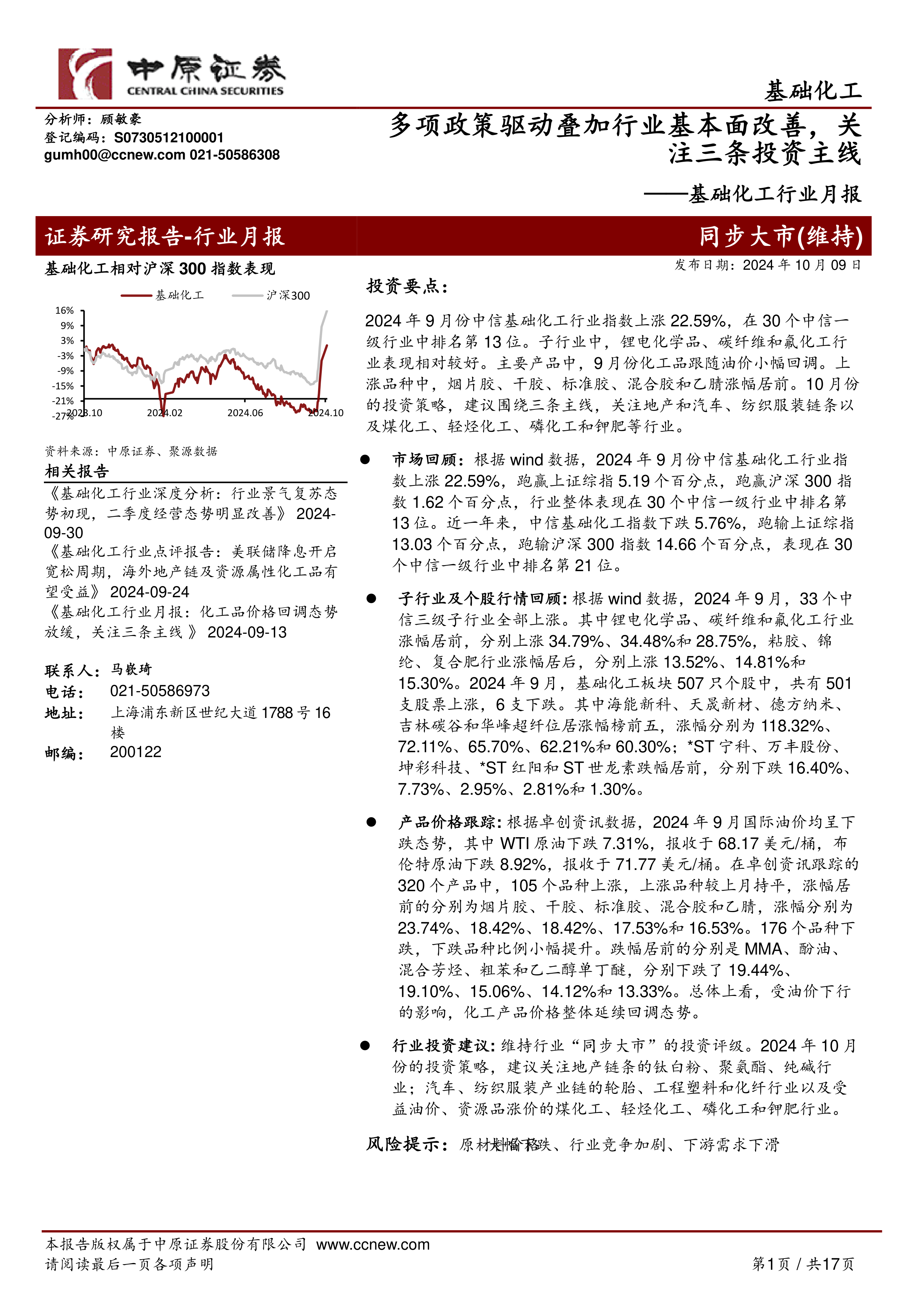 行业投资建议:维持行业“同步大市”的投资评级。2024年10月份的投资策略,建议关注地产链条的钛白粉、聚氨酯、纯碱行业;汽车、纺织服装产业链的轮胎、工程塑料和化纤行业以及受益油价、资源品涨价的煤化工、轻烃化工、磷化工和钾肥行业。