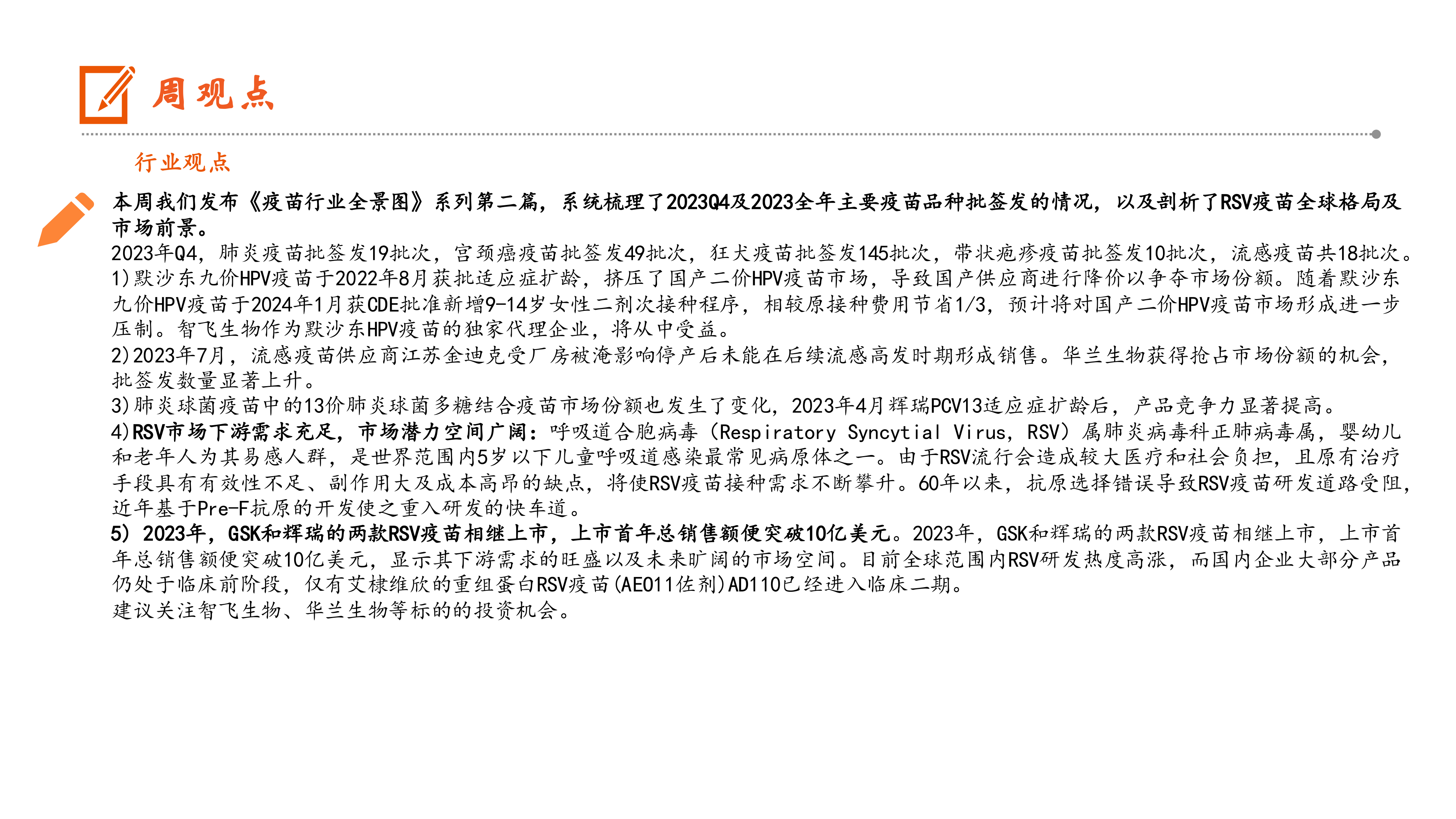 本周我们发布《疫苗行业全景图》系列第二篇,系统梳理了2023Q4及2023全年主要疫苗品种批签发的情况,以及剖析了RSV疫苗全球格局及市场前景。