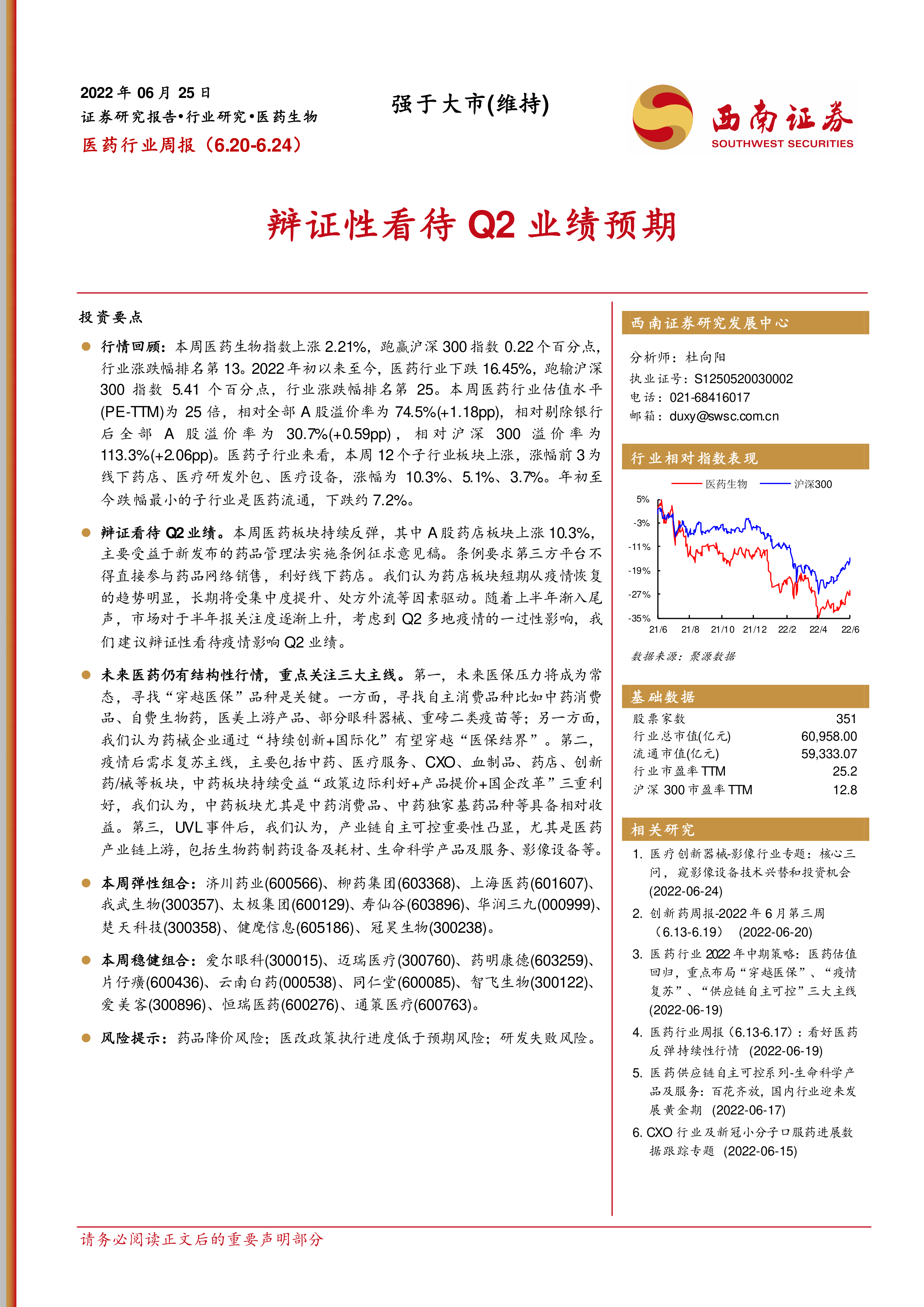 本报告的核心观点是:医药行业在2022年6月20日至24日期间表现强于大盘,但年初至今仍跑输大盘。Q2业绩受疫情影响,需辩证看待。未来医药行业仍存在结构性行情,建议关注“穿越医保”、“疫情后需求复苏”和“产业链自主可控”三大投资主线。