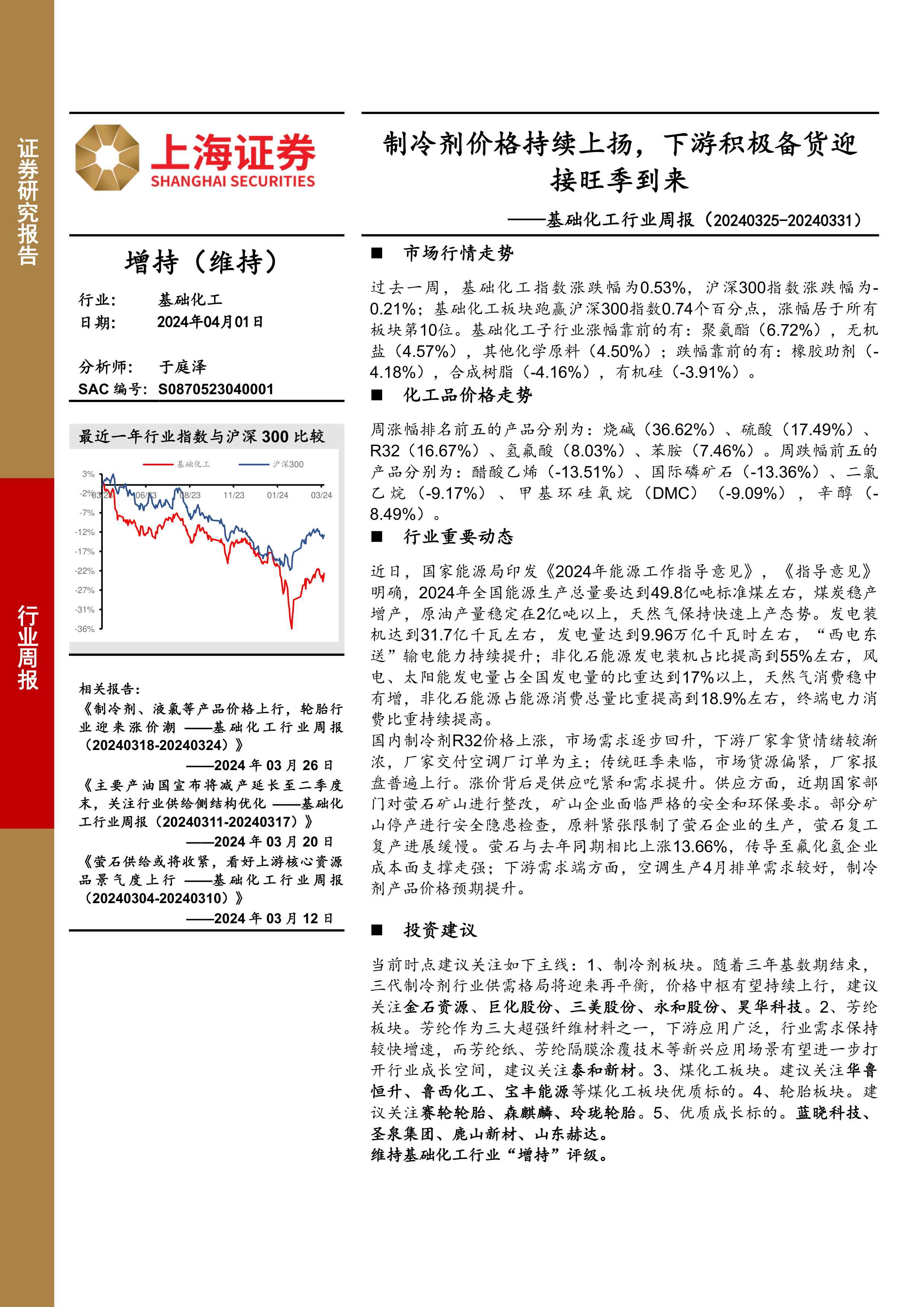 基础化工行业周报:制冷剂价格持续上扬,下游积极备货迎接旺季到来
