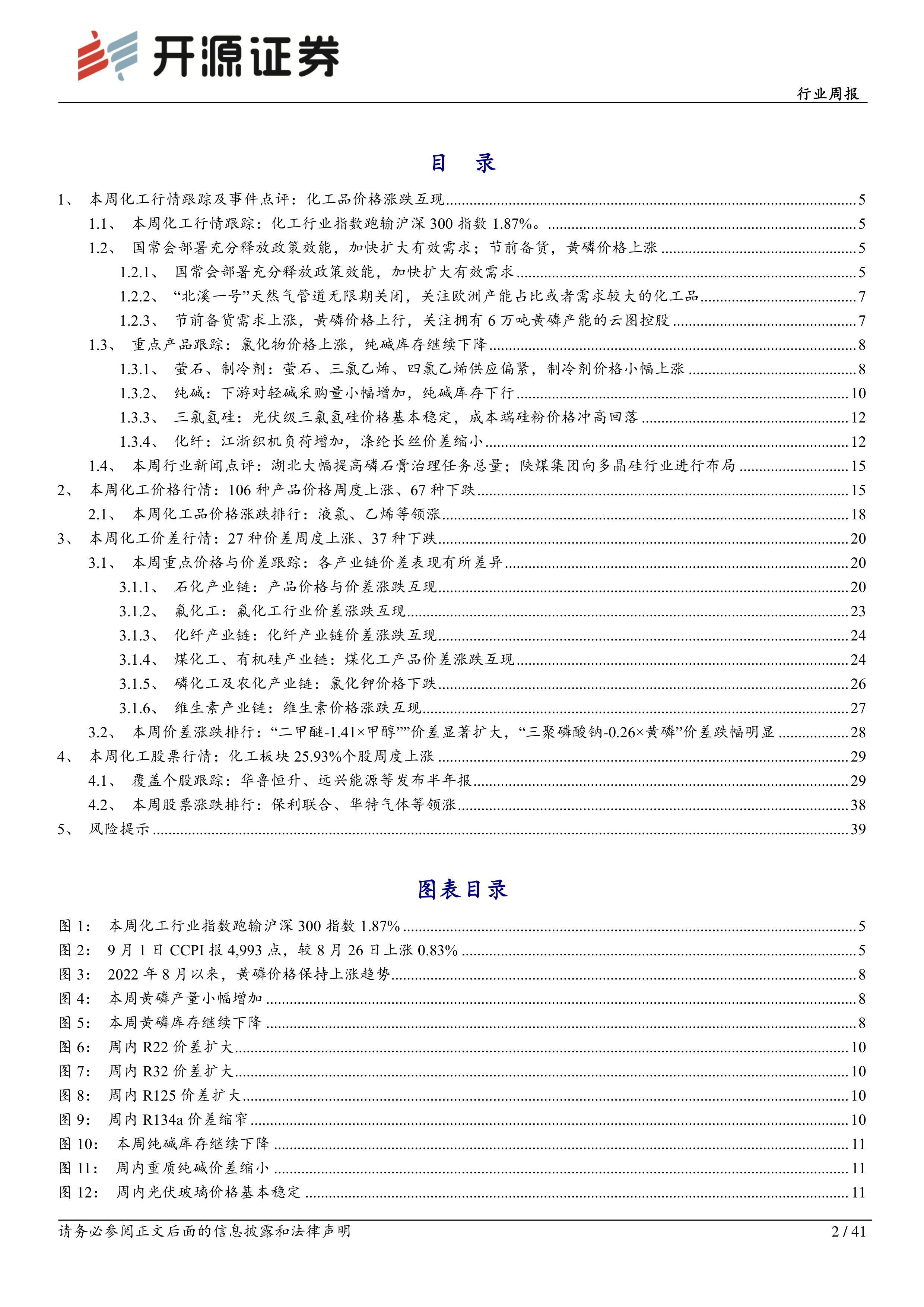 本周化工行业指数跑输沪深300指数1.87%,化工板块个股涨跌互现。具体而言,228种化工产品中,106种价格上涨,67种下跌;72种产品价差中,27种上涨,37种下跌。报告对氯化物价格上涨、纯碱库存继续下降等现象进行了深入分析,并对萤石、制冷剂、三氯氢硅、化纤等重点产品进行了跟踪,指出部分产品供应偏紧,价格上涨。此外,报告还分析了黄磷价格上涨的原因,认为节前备货需求上涨是主要因素。