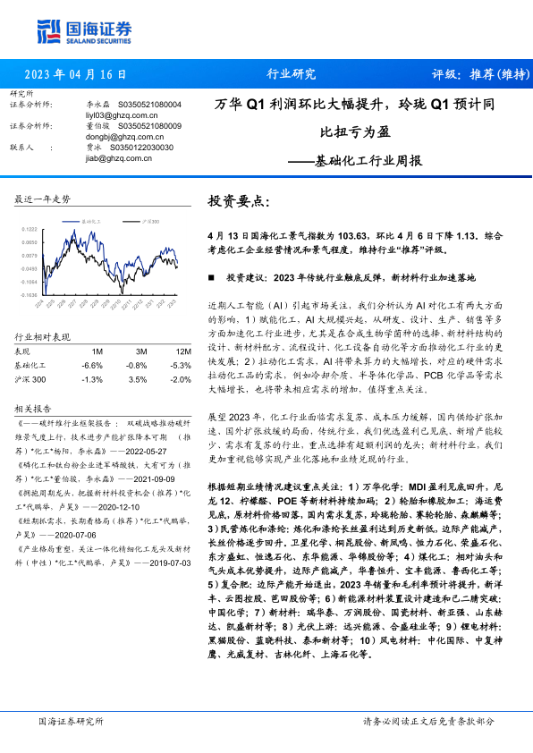 根据短期业绩情况建议重点关注: 1)万华化学: MDI 盈利见底回升,尼龙 12、柠檬醛、 POE 等新材料持续加码; 2)轮胎和橡胶加工:海运费见底,原材料价格回落,国内需求复苏,玲珑轮胎、赛轮轮胎、森麒麟等;3)民营炼化和涤纶:炼化和涤纶长丝盈利达到历史新低,边际产能减产,长丝价格逐步回升。卫星化学、桐昆股份、新凤鸣、恒力石化、荣盛石化、东方盛虹、恒逸石化、东华能源、华锦股份等; 4)煤化工:相对油头和气头成本优势提升,边际产能减产,华鲁恒升、宝丰能源、鲁西化工等;5)复合肥:边际产能开始退出, 2023 年销量和毛利率预计将提升,新洋丰、云图控股、芭田股份等; 6)新能源材料装置设计建造和己二腈突破:中国化学; 7) 新材料:瑞华泰、万润股份、国瓷材料、新亚强、山东赫达、凯盛新材等; 8)光伏上游:远兴能源、合盛硅业等; 9)锂电材料:黑猫股份、蓝晓科技、泰和新材等; 10)风电材料:中化国际、中复神鹰、光威复材、吉林化纤、上海石化等。