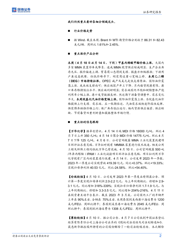 【万华化学】 据卓创资讯, 4 月 14 日纯 MDI 价格 18000 元/吨,环比 4月 7 日上升 350 元/吨; 4 月 14 日聚合 MDI 价格 14775 元/吨,环比 4 月7 日下降 125 元/吨。 4 月 6 日,公司官网披露 MMA 工业化装置改建项目环评征求意见稿,万华拟对现有 1#MMA 装置进行技术改造,相关公用工程及环保工程均依托万华已有设施。 4 月 10 日,公司官网披露 500 吨/年异丙醇胺( IPAM)工业化试验项目环评征求意见稿,项目拟利用万华化学现有厂区内的装置进行改建。 4 月 14 日,公司发布 2023 年一季报,2023 年一季度公司实现营收 419.39 亿元,同比+0.37%,环比+19.33%;实现归母净利润 40.53 亿元,同比-24.58%,环比+54.40%。