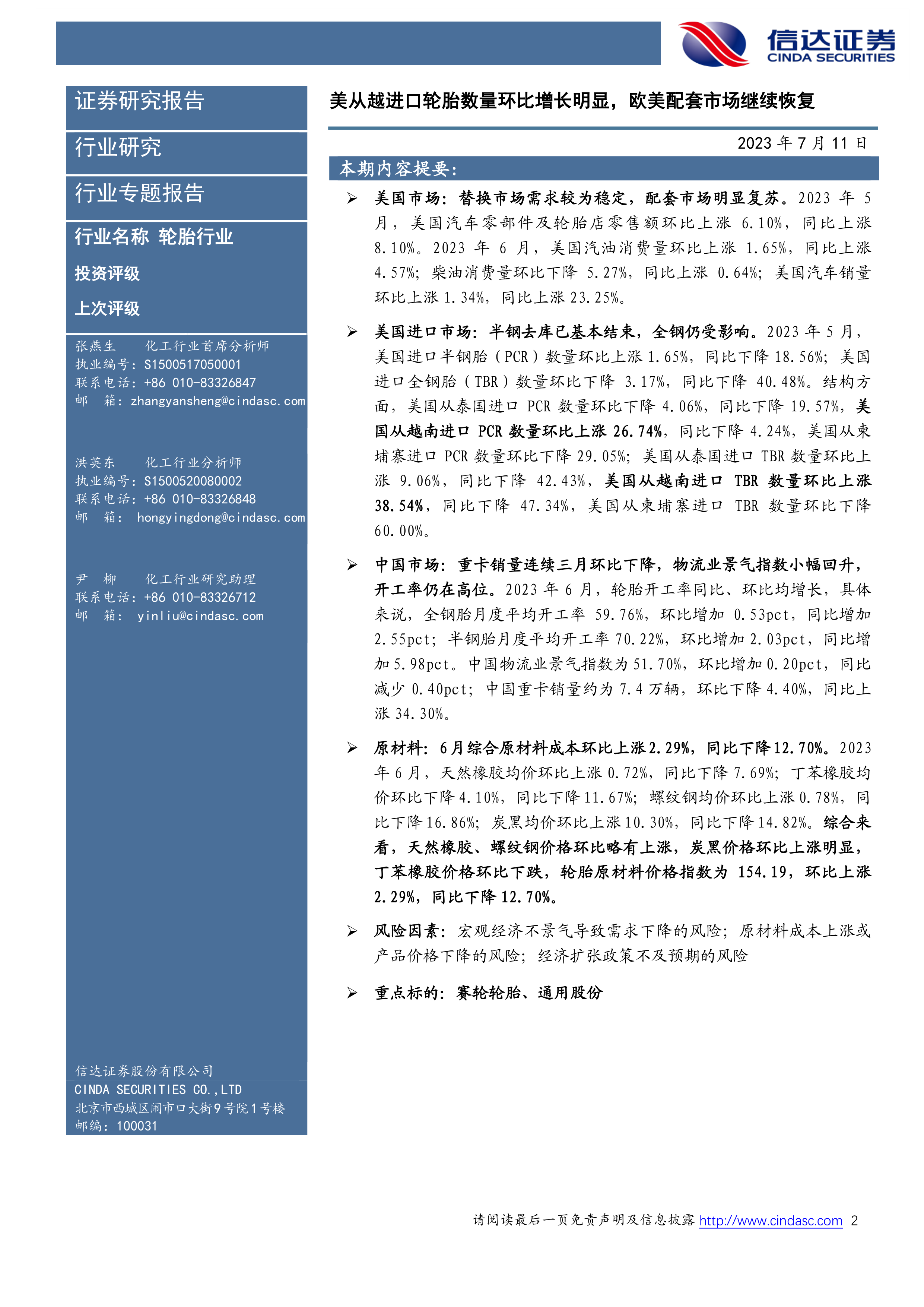 本报告的核心观点是:2023年6月,全球轮胎行业呈现出区域差异化发展态势。中国市场复苏动力趋弱,重卡销量连续三月环比下降,但轮胎开工率却同比环比增长;美国市场需求相对稳定,配套市场明显复苏,但进口全钢胎仍受去库影响;欧洲配套市场继续恢复,但替换市场受高通胀影响表现疲软。原材料价格方面,同比下降,但环比略有上涨,炭黑价格涨幅明显。总体而言,全球轮胎行业面临宏观经济下行、原材料成本波动等风险,但部分地区配套市场复苏为行业发展带来一定利好。
