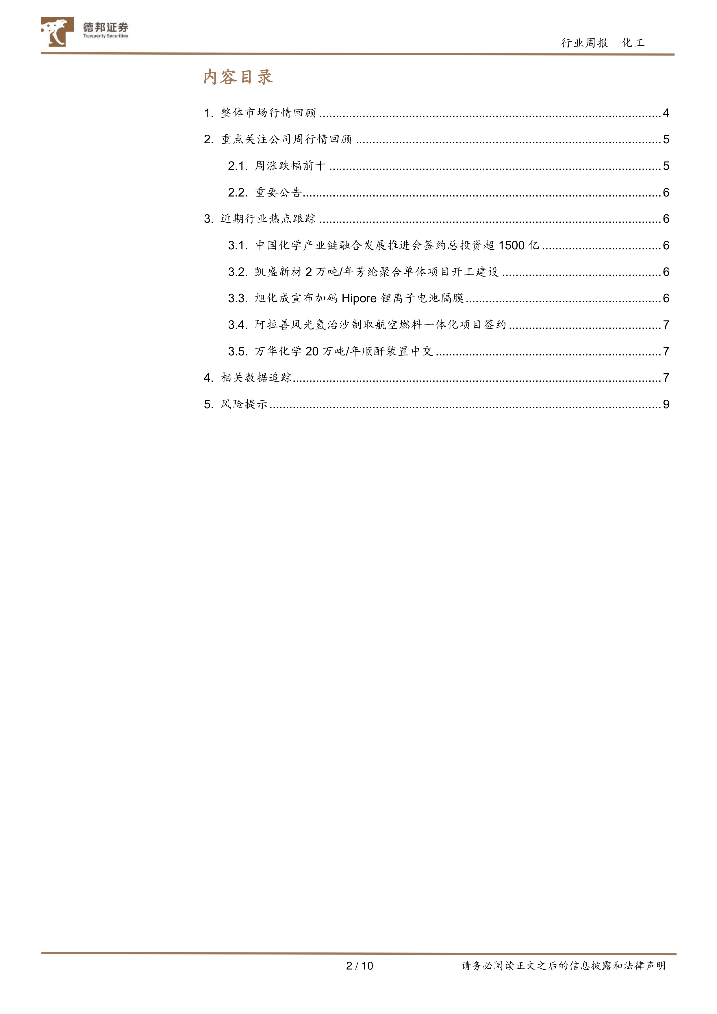 本报告跟踪了多个重要的行业热点事件,包括:中国化学产业链融合发展推进会签约总投资超1500亿元,显示出国家对化学产业发展的支持力度;凯盛新材芳纶聚合单体项目开工,体现了国内新材料产业的快速发展;旭化成加码Hipore锂离子电池隔膜产能,反映了全球新能源汽车市场对锂电材料的需求;阿拉善风光氢治沙制取航空燃料一体化项目签约,标志着绿色能源和航空燃料领域的创新发展;万华化学20万吨/年顺酐装置中交,展现了化工行业的技术升级和产能扩张。