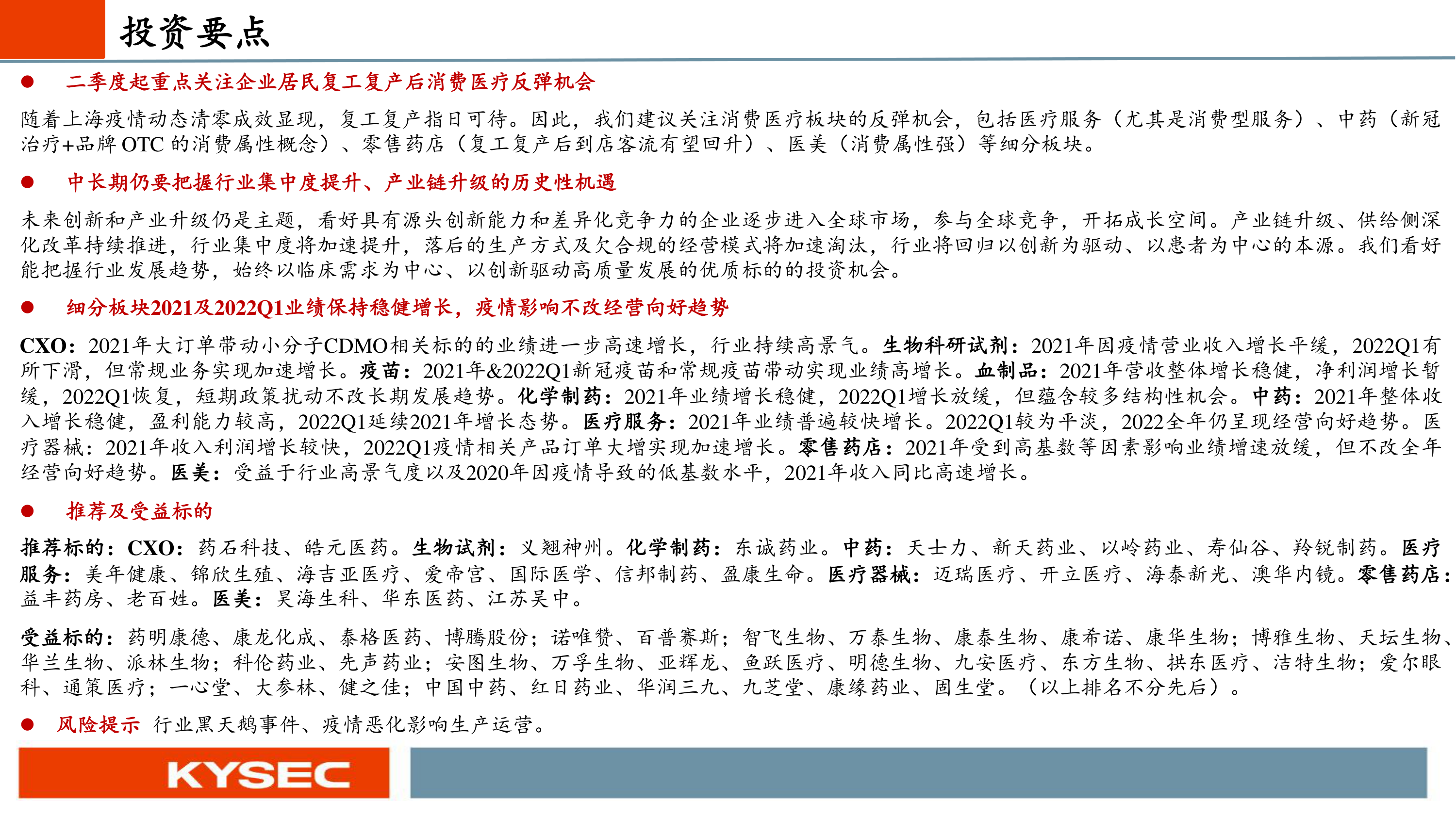 受益标的:药明康德、康龙化成、泰格医药、博腾股份;诺唯赞、百普赛斯;智飞生物、万泰生物、康泰生物、康希诺、康华生物;博雅生物、天坛生物、华兰生物、派林生物;科伦药业、先声药业;安图生物、万孚生物、亚辉龙、鱼跃医疗、明德生物、九安医疗、东方生物、拱东医疗、洁特生物;爱尔眼科、通策医疗;一心堂、大参林、健之佳;中国中药、红日药业、华润三九、九芝堂、康缘药业、固生堂。(以上排名不分先后)。