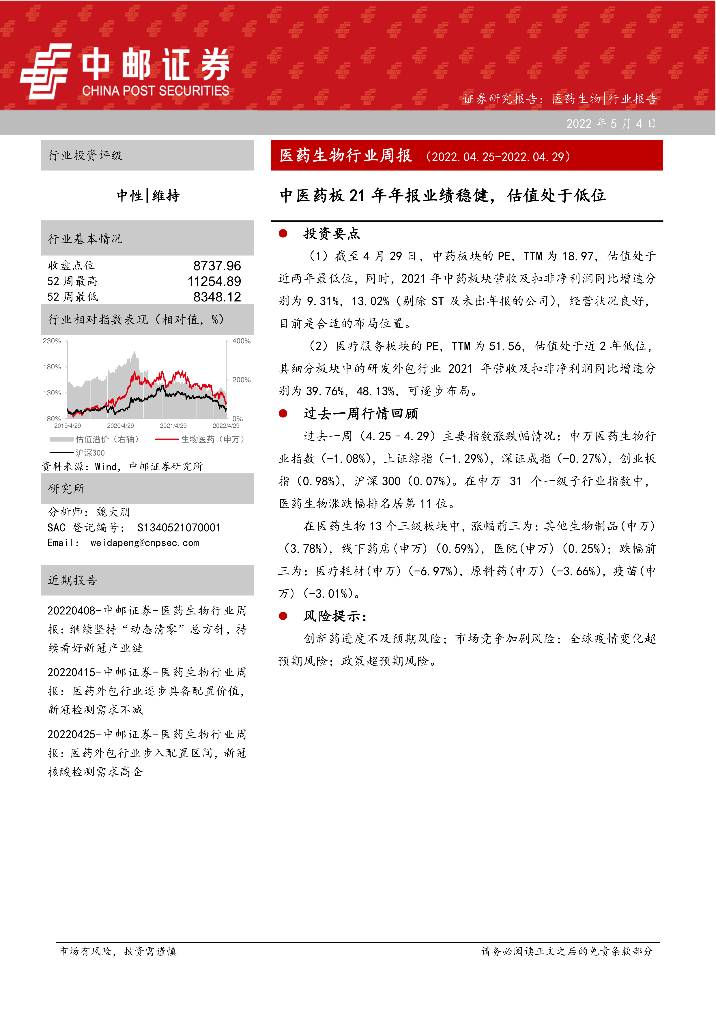 本报告的核心观点是:截至2022年4月29日,医药生物行业整体表现疲软,申万医药生物行业指数下跌1.08%。然而,部分细分领域,如中药板块和医疗服务板块中的研发外包行业,展现出一定的投资价值。中药板块估值处于近两年低位,且2021年营收和扣非净利润增速良好;研发外包行业2021年营收和扣非净利润增速显著。报告建议关注这些估值较低且增长潜力较大的细分领域,同时提示了创新药研发进度不及预期、市场竞争加剧、全球疫情变化以及政策超预期等风险。