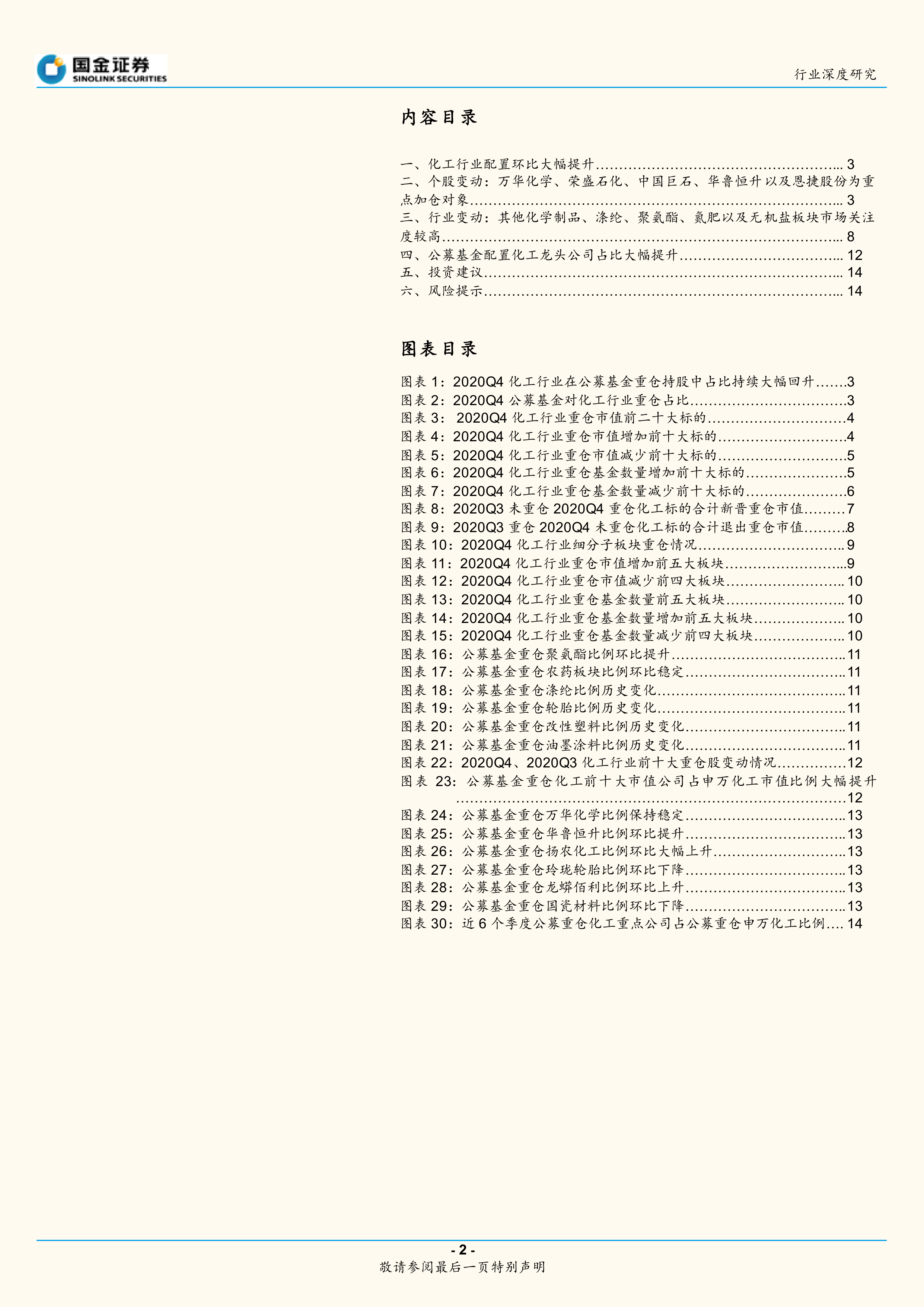 本报告根据2020年第四季度化工行业公募基金持仓数据,从行业整体配置、个股变动、细分子板块变动以及龙头企业配置等多个维度进行了深入分析。