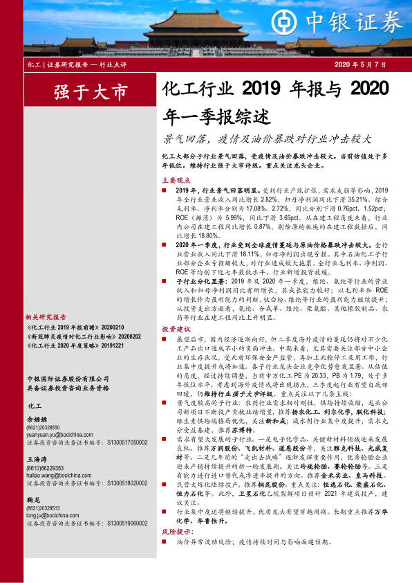 本报告的核心观点是:2019年中国化工行业整体景气度回落,2020年一季度受疫情和油价暴跌双重冲击,行业盈利能力大幅下降,但部分子行业表现强劲,行业集中度提升趋势加速。展望后市,虽然海外疫情影响仍存,但行业有望自底部回暖,维持行业强于大市评级,建议重点关注景气度高、需求增长潜力大的子行业龙头企业。