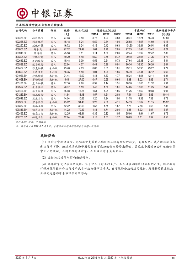 本报告基于对2019年年报和2020年一季度报数据的全面分析,揭示了中国化工行业在面临疫情和油价暴跌冲击下的整体运行情况及子行业间的显著分化。尽管行业整体盈利能力下降,但部分子行业表现强劲,行业集中度提升趋势加速。展望后市,虽然外部环境仍存在不确定性,但行业有望自底部回暖,龙头企业将受益于行业整合和集中度提升。报告提出的投资建议,为投资者提供了有价值的参考信息。 需要注意的是,报告中提到的投资建议并非绝对保证,投资者需根据自身情况进行独立判断,并承担相应的投资风险。