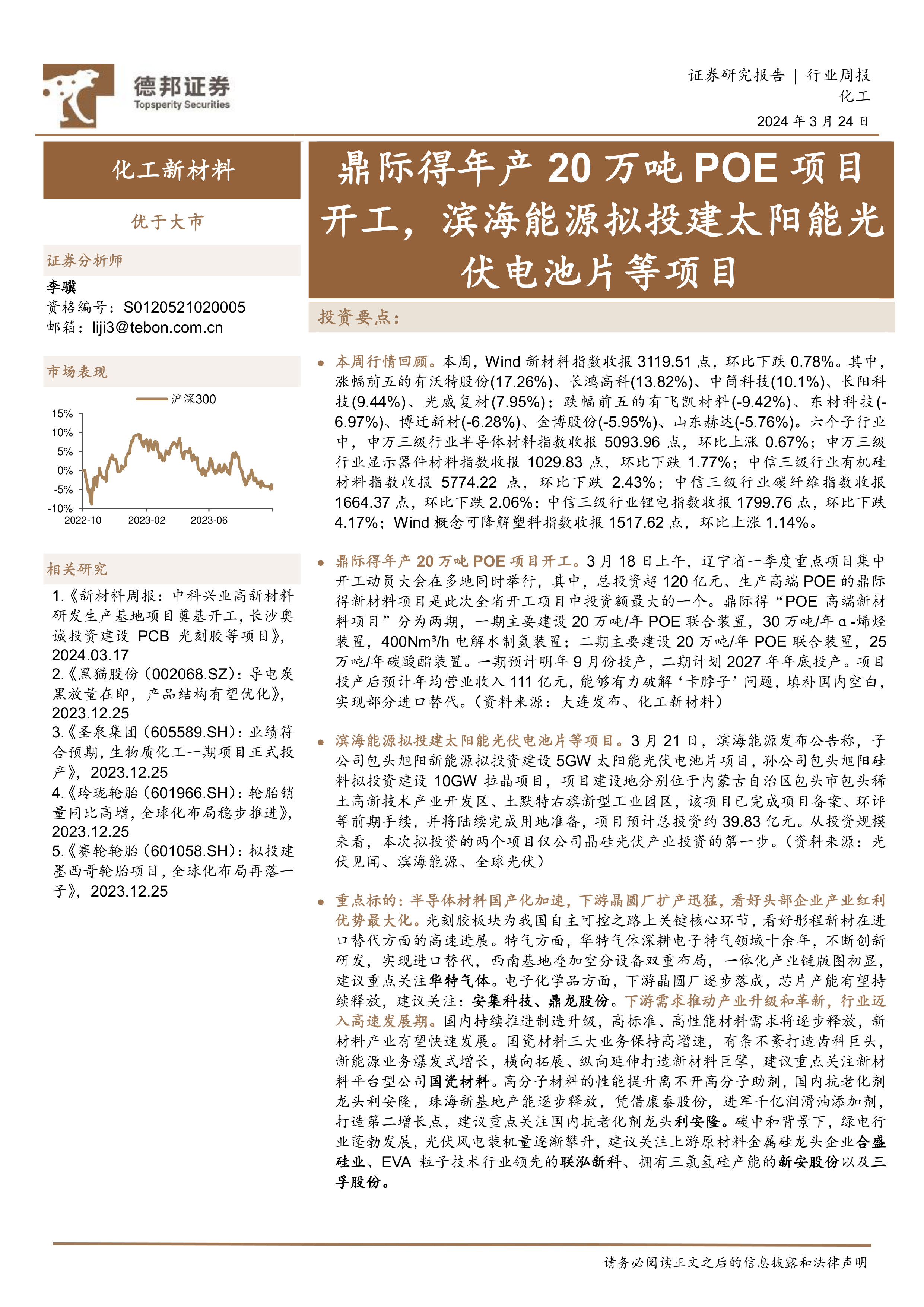 化工新材料行业周报:鼎际得年产20万吨POE项目开工,滨海能源拟投建太阳能光伏电池片等项目