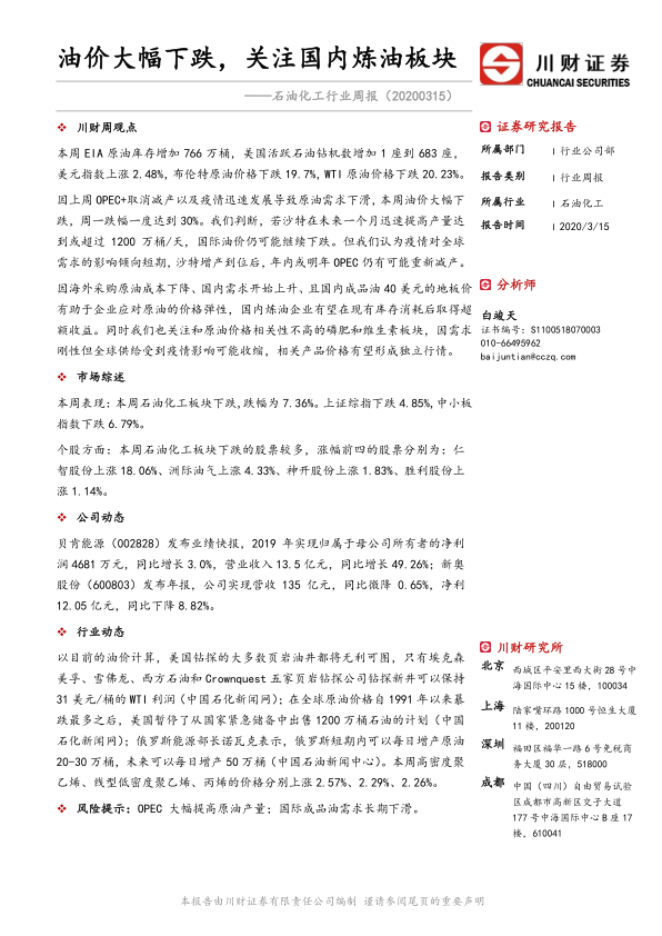 本报告分析了国际油价大幅下跌的背景,并对国内炼油板块和部分化工品板块的市场表现进行了总结。国际油价下跌的主要原因是OPEC+取消减产和疫情导致的需求下降,但国内炼油企业由于成本下降、国内需求上升以及价格地板的支撑,有望在库存消耗后获得超额收益。此外,磷肥和维生素板块由于需求刚性和供给收缩,价格有望形成独立行情。报告也提示了OPEC大幅提高原油产量和国际成品油需求长期下滑的风险。 总而言之,本报告对当前石油化工行业形势进行了较为全面的分析,并对投资者提供了参考信息。 然而,国际形势和疫情发展存在不确定性,投资者需谨慎决策。