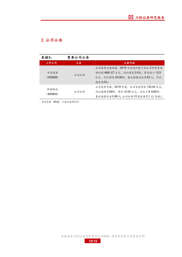 贝肯能源发布2019年业绩快报,净利润同比增长3.0%,营业收入同比增长49.26%。新奥股份发布2019年年报,营收同比微降0.65%,净利润同比下降8.82%。