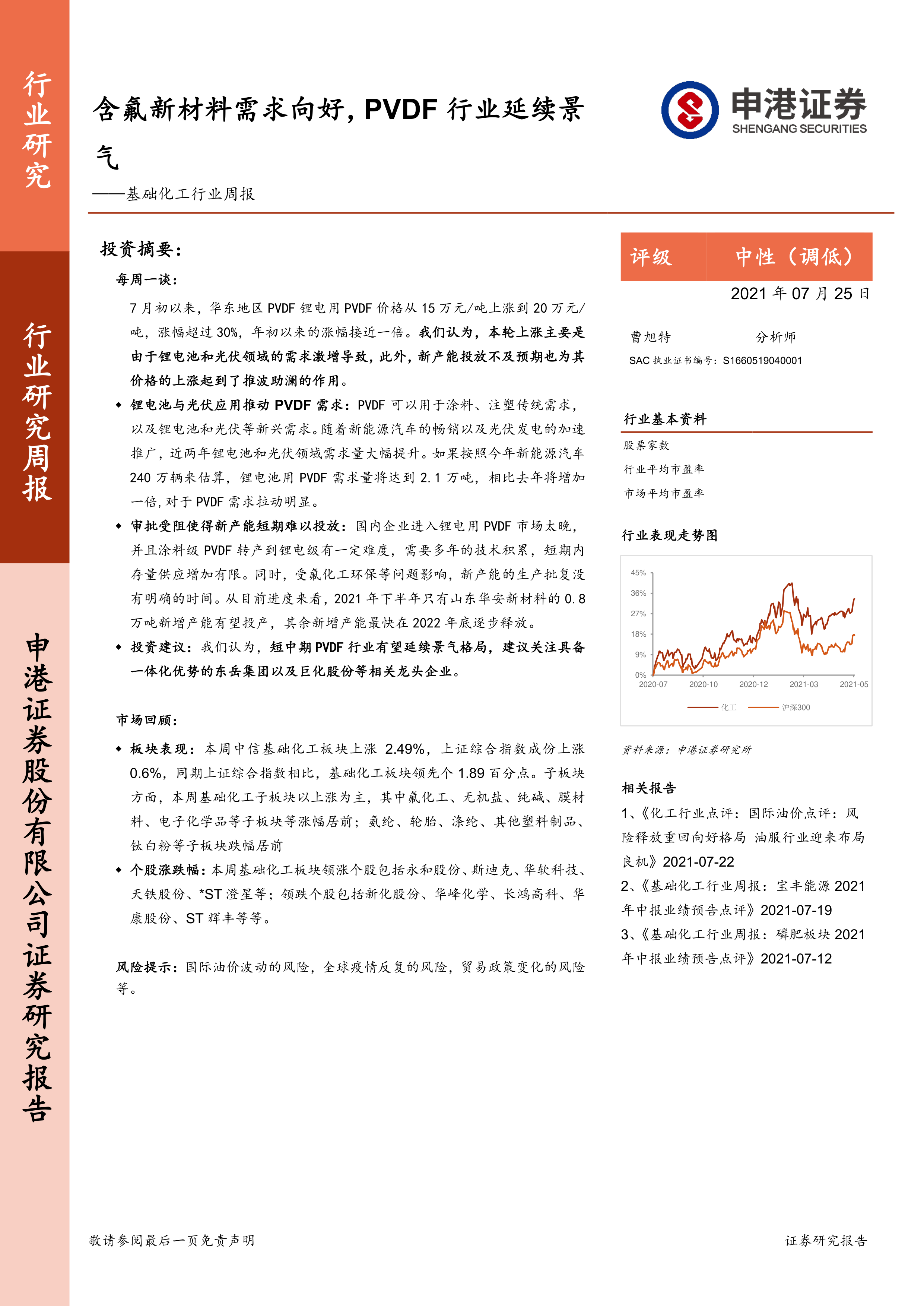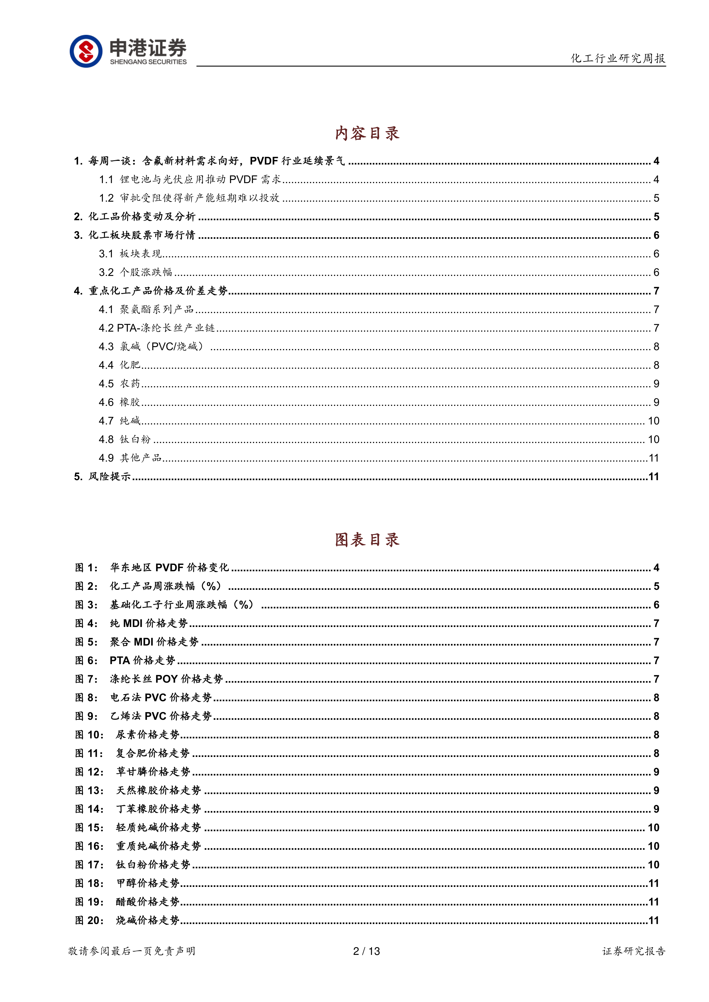 本报告通过对PVDF行业需求、产能、价格以及化工板块整体市场行情的分析,得出PVDF行业短期内景气度有望延续的结论。锂电池和光伏行业的高速发展驱动了PVDF需求的强劲增长,而新产能投放的滞后则加剧了供需紧张局面,从而支撑PVDF价格持续上涨。投资者应关注具备一体化优势的行业龙头企业,但需注意国际油价波动、全球疫情反复以及贸易政策变化等风险。 报告还对其他主要化工产品的价格走势进行了分析,为投资者提供更全面的市场信息。