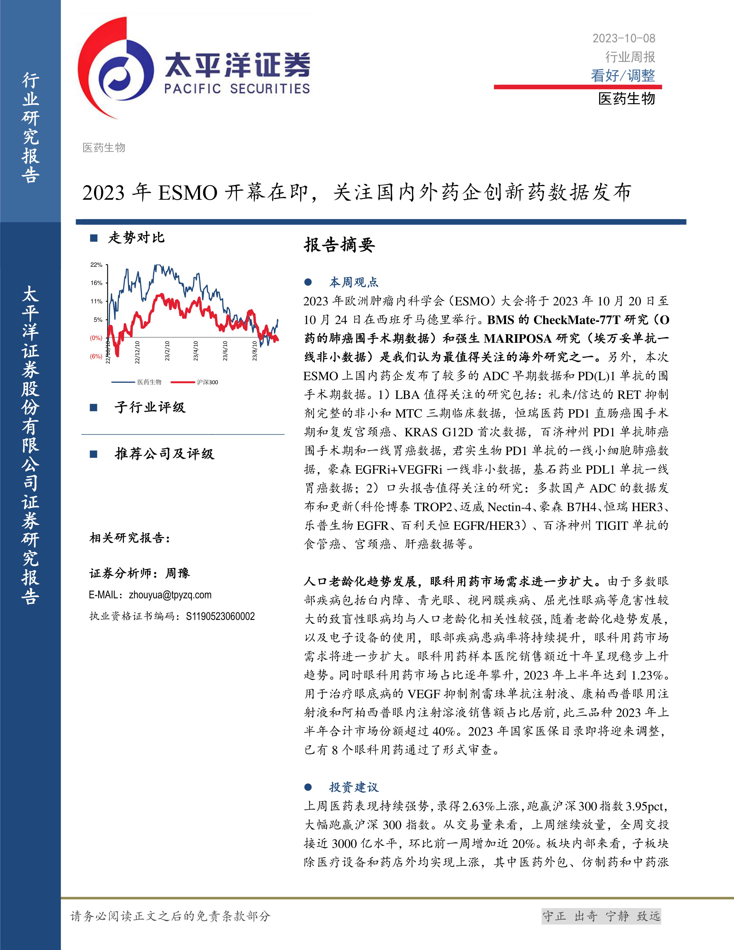 本周报告重点关注即将召开的2023年ESMO大会,以及国内眼科用药市场。ESMO大会上,BMS和强生等国际药企将发布重要临床数据,例如BMS的CheckMate-77T研究(O药的肺癌围手术期数据)和强生MARIPOSA研究(埃万妥单抗一线非小数据)。 国内药企也积极参与,发布了大量ADC早期数据和PD(L)1单抗的围手术期数据。报告详细列举了LBA(Late-Breaking Abstract)和口头报告中值得关注的研究,包括礼来/信达的RET抑制剂、恒瑞医药的PD1、百济神州的PD1和TIGIT单抗、君实生物的PD1、豪森的EGFRi+VEGFRi以及基石药业的PDL1单抗等,并对这些研究的背景和看点进行了深入分析,并通过图表形式清晰地展现了相关信息。