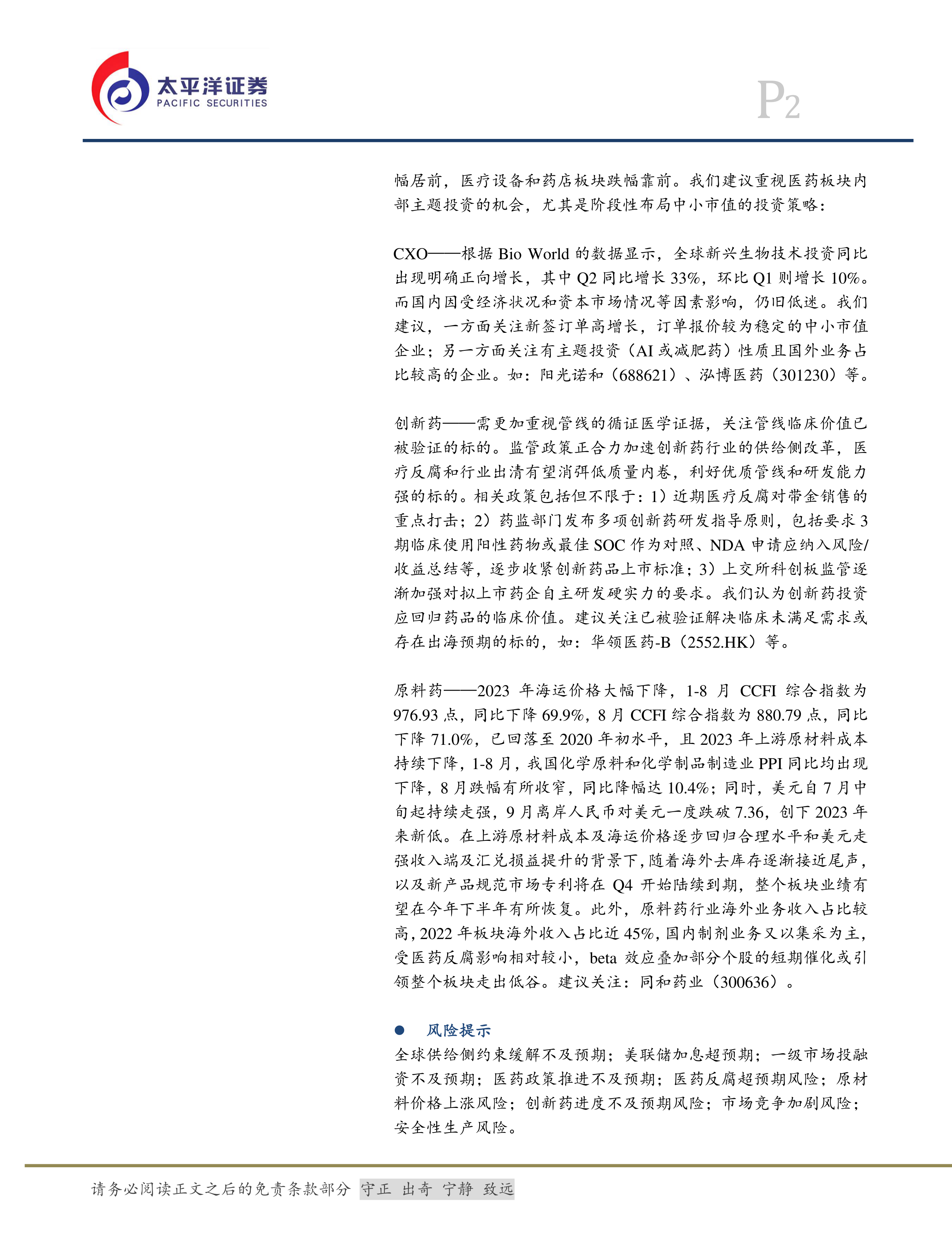 原料药——2023年海运价格大幅下降,1-8月CCFI综合指数为976.93点,同比下降69.9%,8月CCFI综合指数为880.79点,同比下降71.0%,已回落至2020年初水平,且2023年上游原材料成本持续下降,1-8月,我国化学原料和化学制品制造业PPI同比均出现下降,8月跌幅有所收窄,同比降幅达10.4%;同时,美元自7月中旬起持续走强,9月离岸人民币对美元一度跌破7.36,创下2023年来新低。在上游原材料成本及海运价格逐步回归合理水平和美元走强收入端及汇兑损益提升的背景下,随着海外去库存逐渐接近尾声,以及新产品规范市场专利将在Q4开始陆续到期,整个板块业绩有望在今年下半年有所恢复。此外,原料药行业海外业务收入占比较高,2022年板块海外收入占比近45%,国内制剂业务又以集采为主,受医药反腐影响相对较小,beta效应叠加部分个股的短期催化或引领整个板块走出低谷。建议关注:同和药业(300636)。